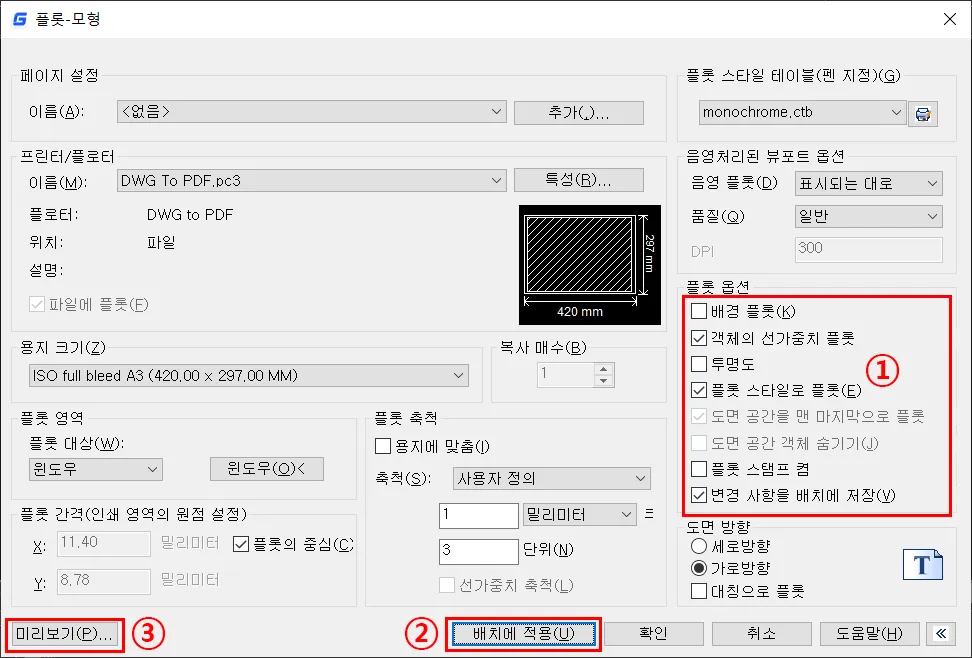 - 플롯 스타일 테이블에서 원하는 `CTB`파일은 선택한다. 기본적으로 칼러로 도면을 출력하는 경우에는 `acac.ctb`를 사용하고, 흑백으로 출력하는 경우에는 `monochrome.ctb`를 사용하면 된다. 여기서는 `monochrome.ctb`로 흑백 출력하는 내용으로 설명한다.
