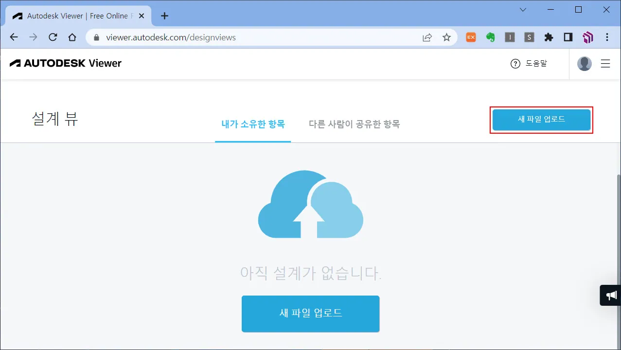 설계 뷰에 기존에 열람한 도면이 있다면, 리스트에 나타나고, 새로운 도면 및 3D 데이터를 검토하겠다면, "새 파일 업로드"를 통해 파일을 업로드할 수 있다.