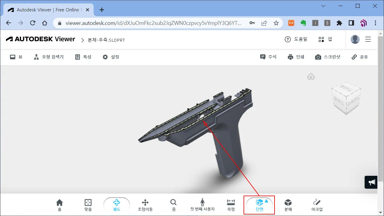 일반적인 3D 뷰어에서 제공하고 있는 단면 보기 및 조립품인 경우, 분해도 작성 기능도 3D 파일을 가져왔을 때 사용할 수 있다.