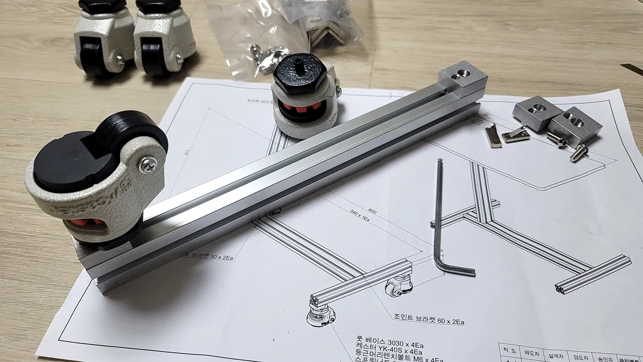 3030 프로파일에 우선, 풋 베이스 3030을 둥근 머리렌치볼트와 정사각형 너트로 먼저 조립한 후, 캐스터를 조립하면 된다.