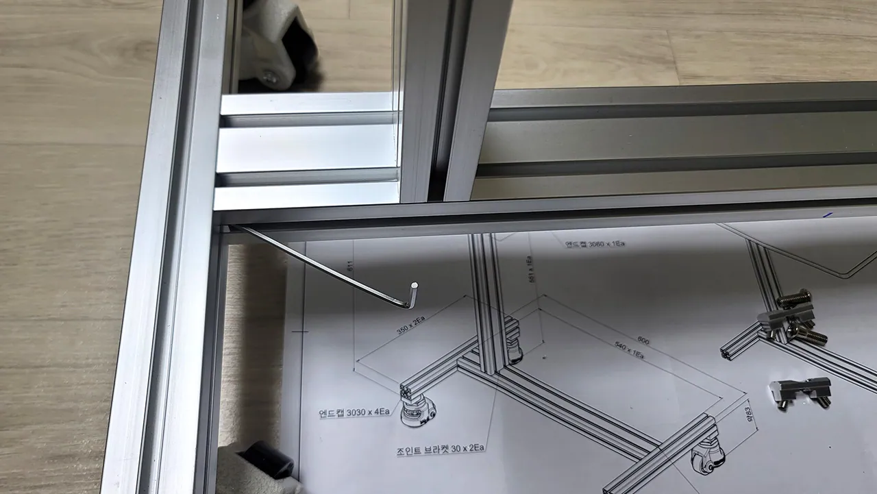 이번 프로파일 책상 구조에서 가장 큰 문제점은 흔들림이다. 지난 두어 번의 프로파일 조립을 통해, 한 개의 다리만 가지고 있으면, 분명 흔들리 것 같아, 기둥 다리와 하부 지지대를 전부 3060으로 했지만, 그래도 한 개의 다리는 흔들리는 것이다.
