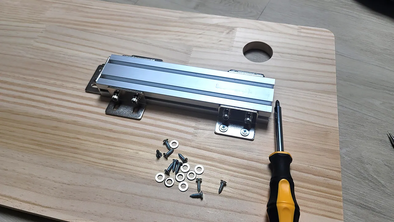 판재의 위 부분을 밑어로 엎어두고, 앞에 조립해 둔 상판 지지대 프로파일이 배치될 위치를 지정한 후, 스틸 브라켓이 나무 바닥에 붙도록 하고, 셈스렌치볼트 어느 정도 힘껏 조여서 고정한다.