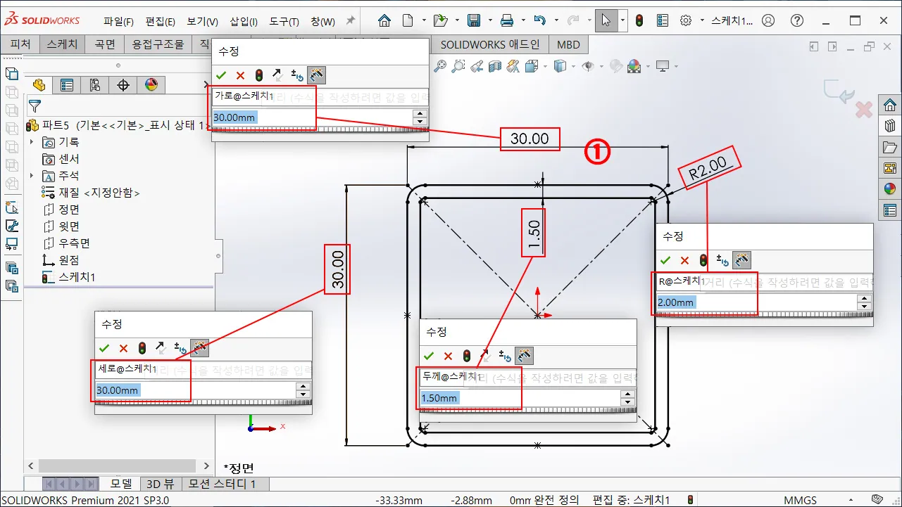 좌측이미지 - 스케치 작성 완료 후, 상단 메뉴를 통해서 설계 변수 테이블로 접근한다.