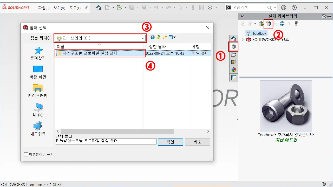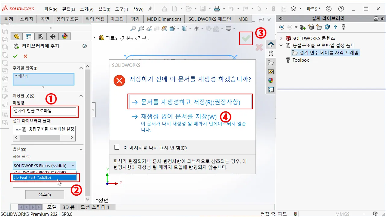 ② 옵션에서 파일 형식은 무조건 Lib Feat Part (*.sldlfp)로 선택하고, ③ 확인을 클릭한다.