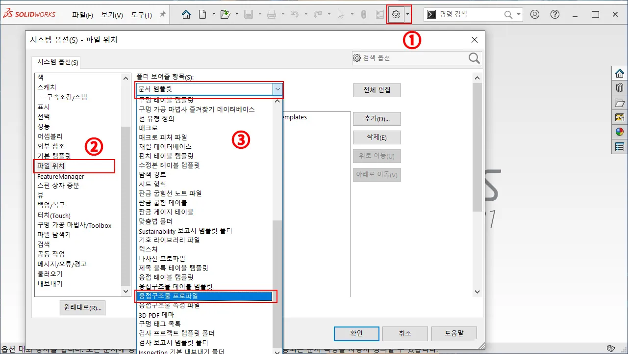 옵션에서 용접 구조물 프로파일 폴더 지정