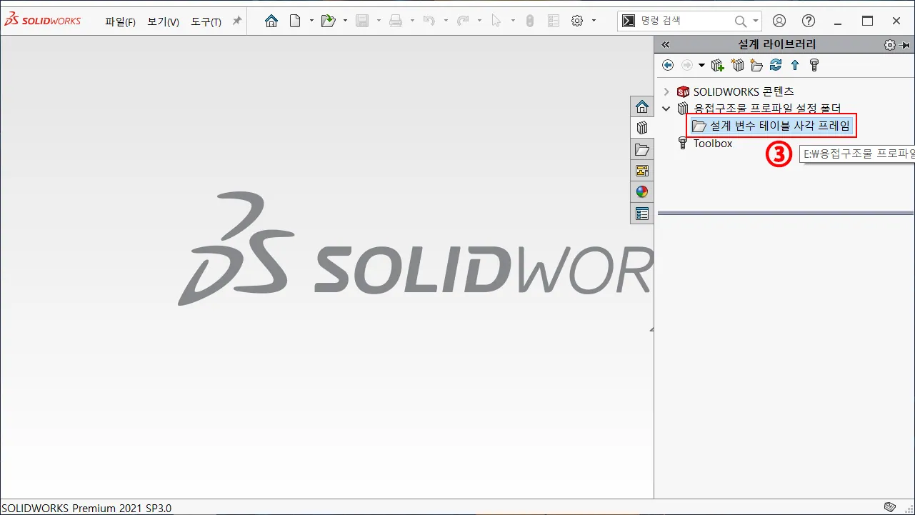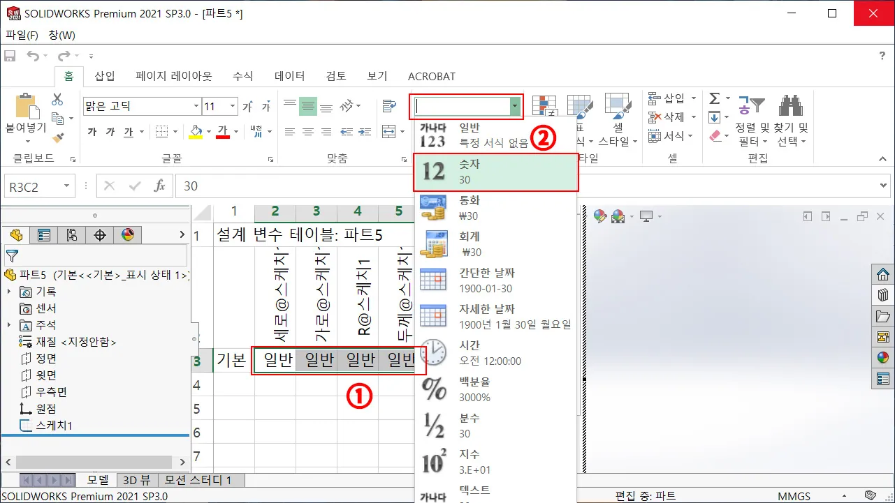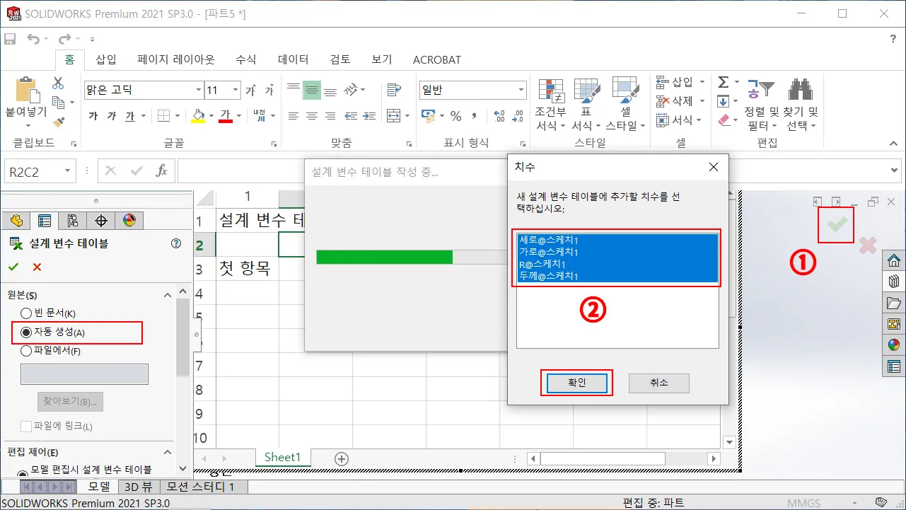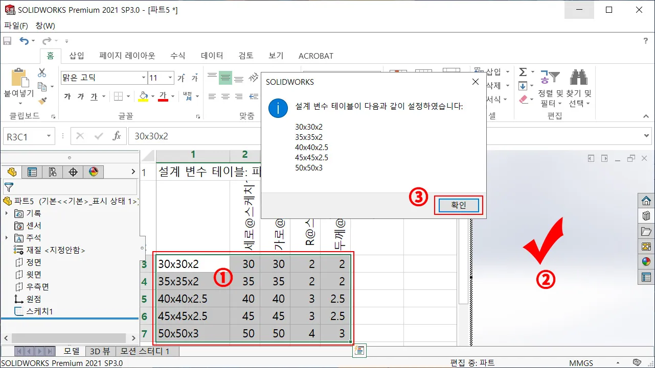 ② 데이터 지정이 완료되고, 작업 화면을 클릭하면 자동으로 솔리드웍스에 삽입 저장되며, ③ 설계 변수 테이블에 적용된 변수명을 확인한다.