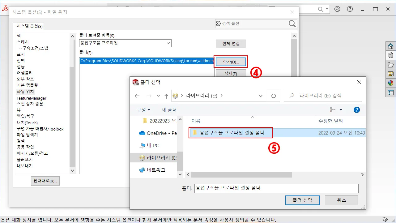 생성한 프로파일 기준 폴더를 용접 구조물 프로파일 폴더로 추가 설정한다.