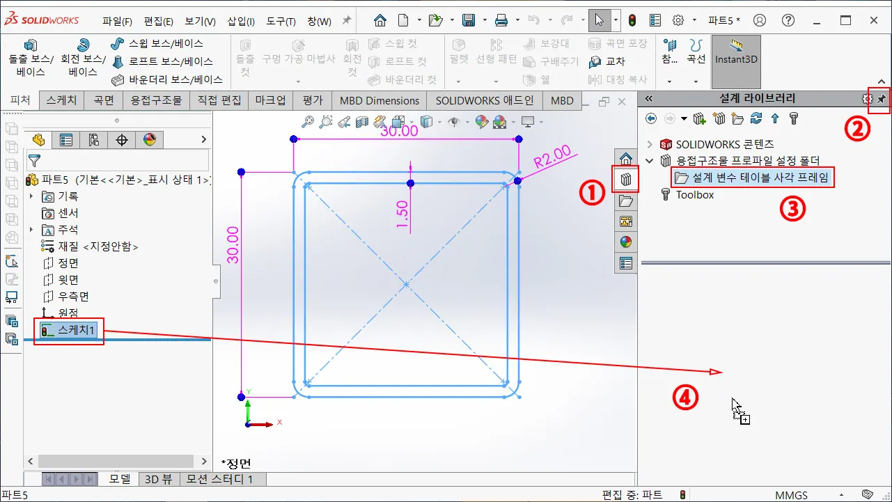 ③ 생성한 기준 폴더 하위에 있는 표준 규격 폴더를 선택하고, ④ 스케치 마무리된 스케치를 선택해서 드래그 앤 드롭으로 라이브러리 창 폴더에 놓는다.