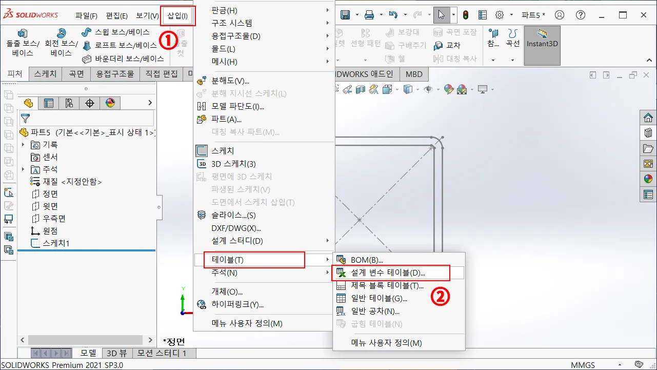 ① 상단 메뉴 -> 삽입 -> 테이블에서 ② 설계 변수 테이블을 클릭한다.