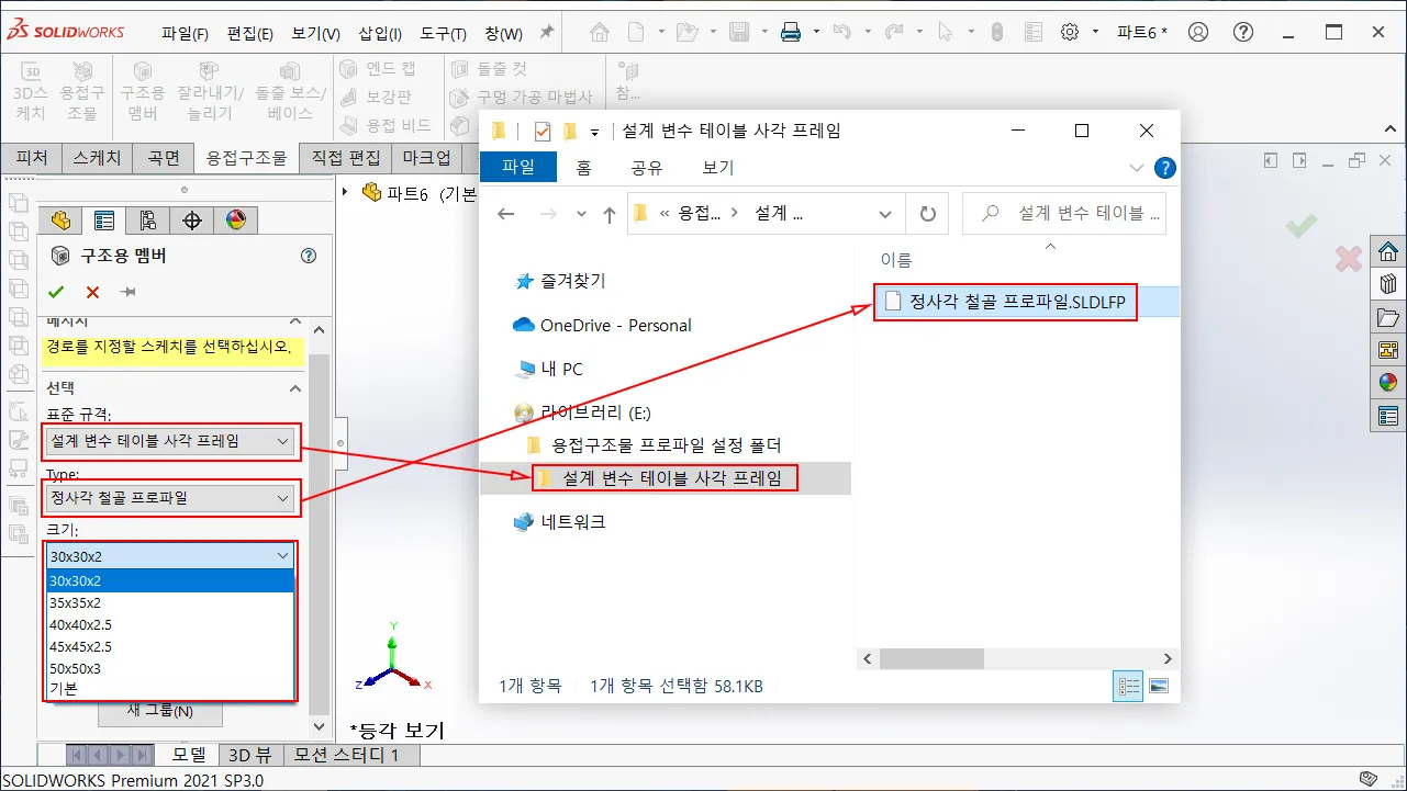다만, Type을 담당하는 부분에서, 이번에는 설계 변수 테이블이 적용된 프로파일 라이브러리가 Type으로 적용되었으며, 설정된 설계 변수 테이블 항목이 크기로 지정되는 구조이다.