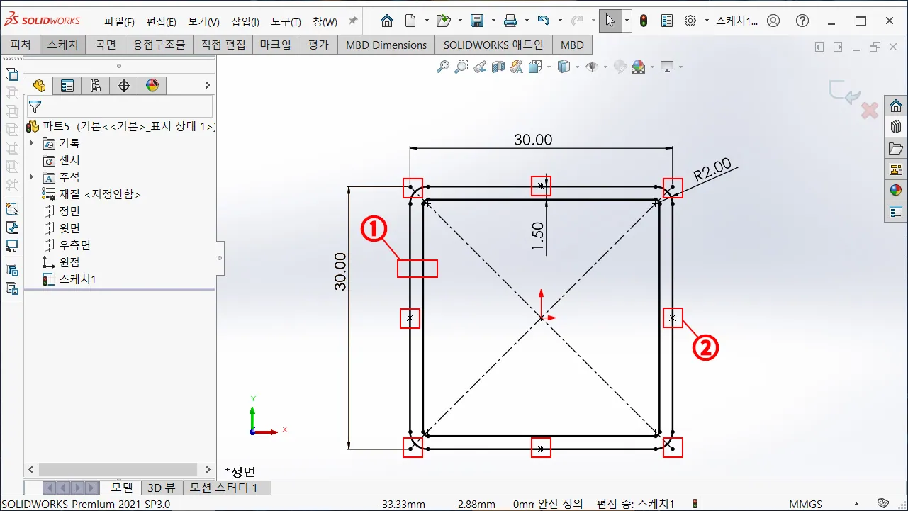※ 스케치 점은 프로파일 가장자리 객체에 총 9개 또는 코너에 있는 점과 원점이 있다면, 제외한 4개의 점을 선분 중간에 중간점 구속 또는 중간점에 지정으로 넣는다.