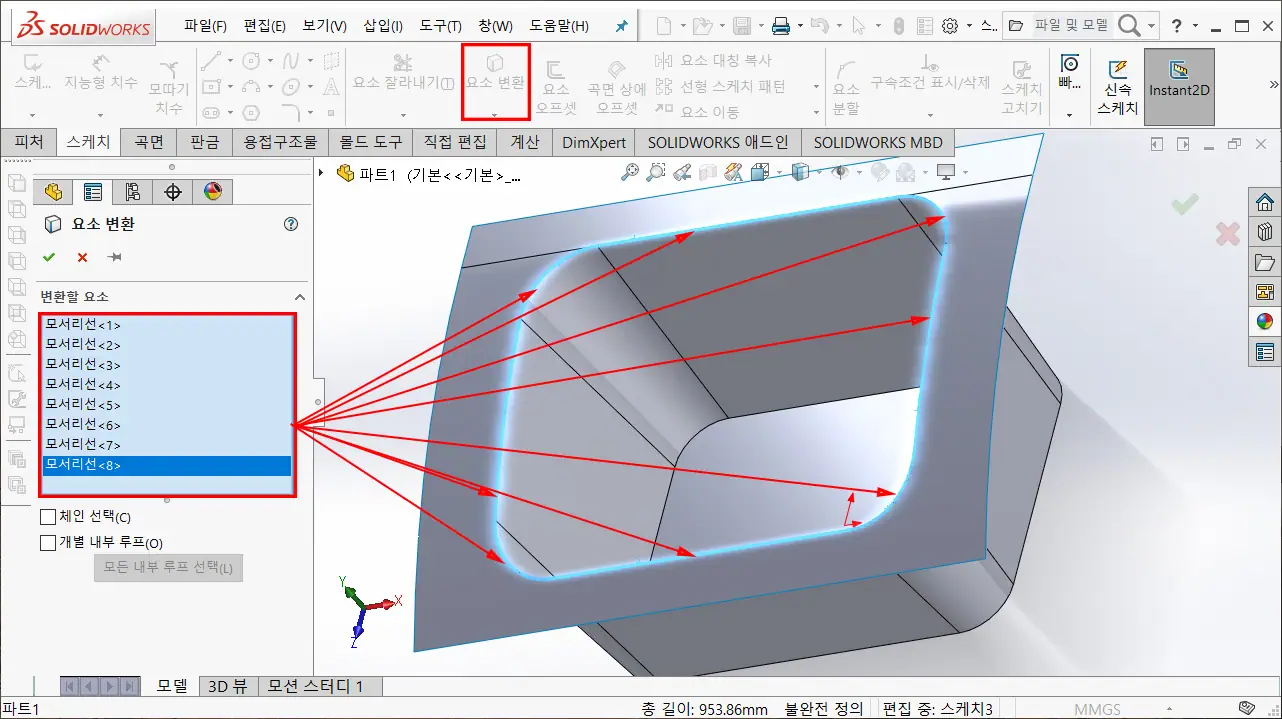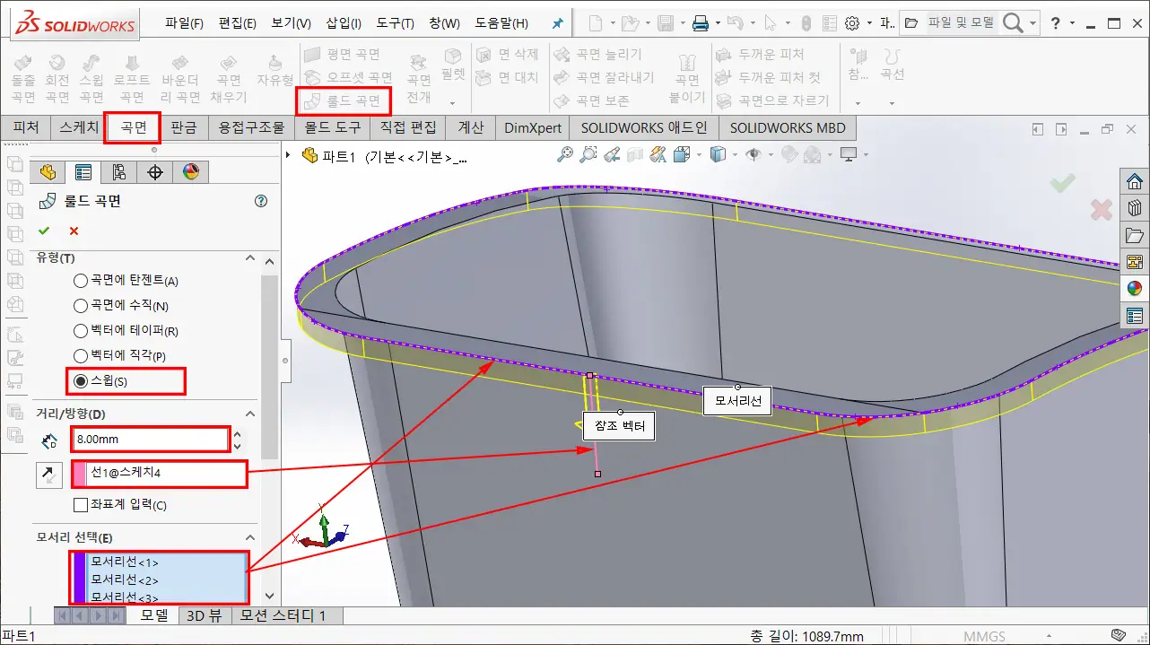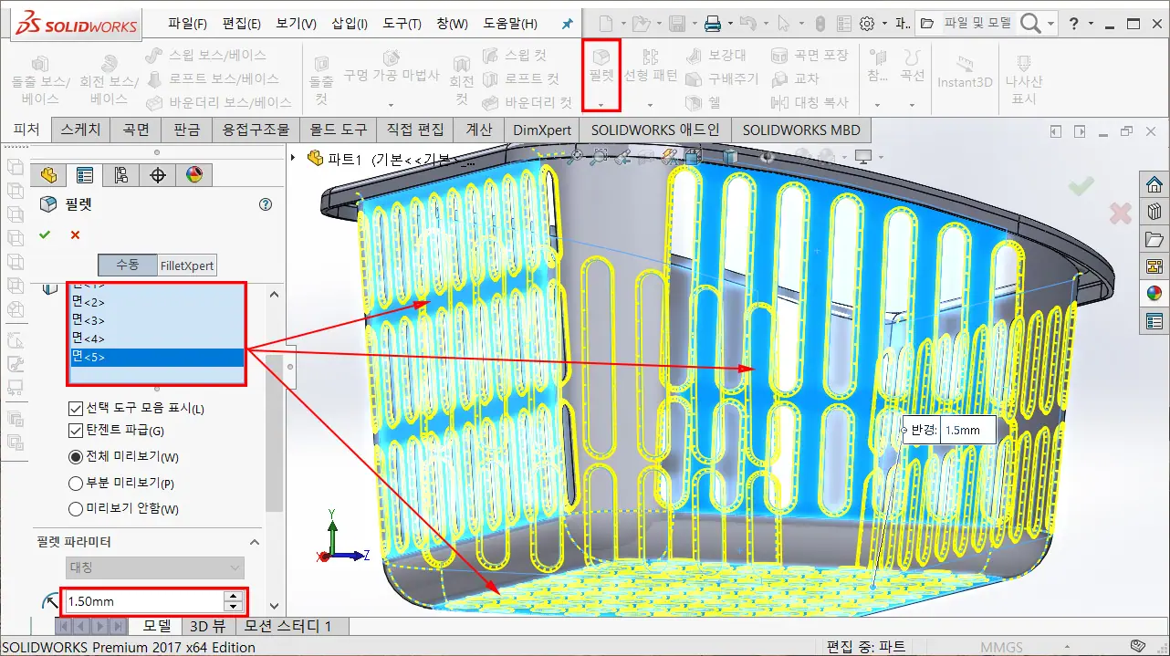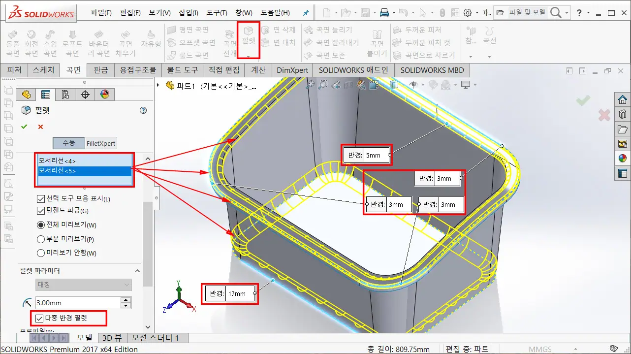 ② 하나의 곡면으로 붙었다면, 곡면 필렛을 이용하여, 도면과 같이 필요한 모서리에 모깎기를 지정하는데, 다중모서리 필렛 기능을 이용해서 필요한 모서리에 값을 부여하면 된다.