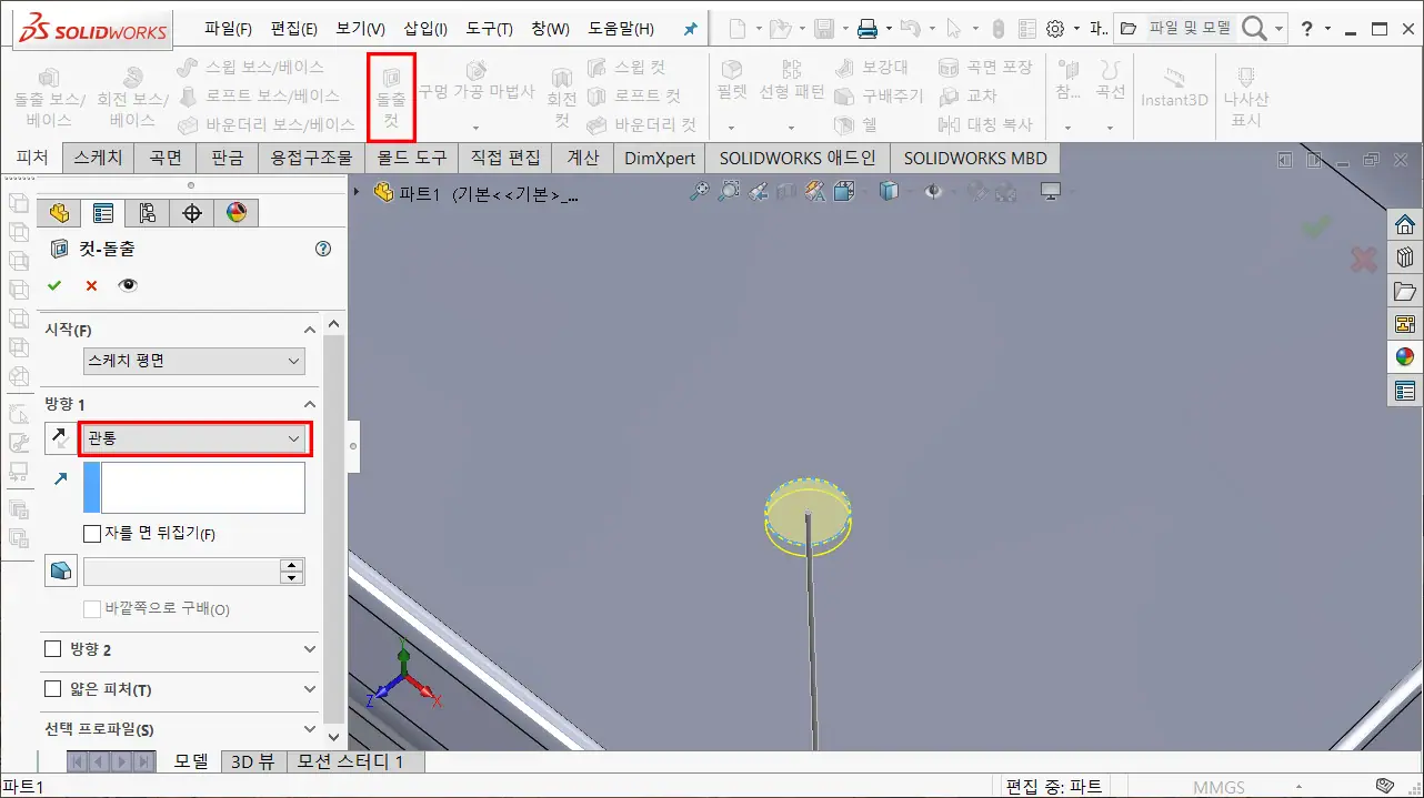 ② 돌출 컷을 실행하고, 금방 스케치한 원을 관통으로 구멍을 생성한다.