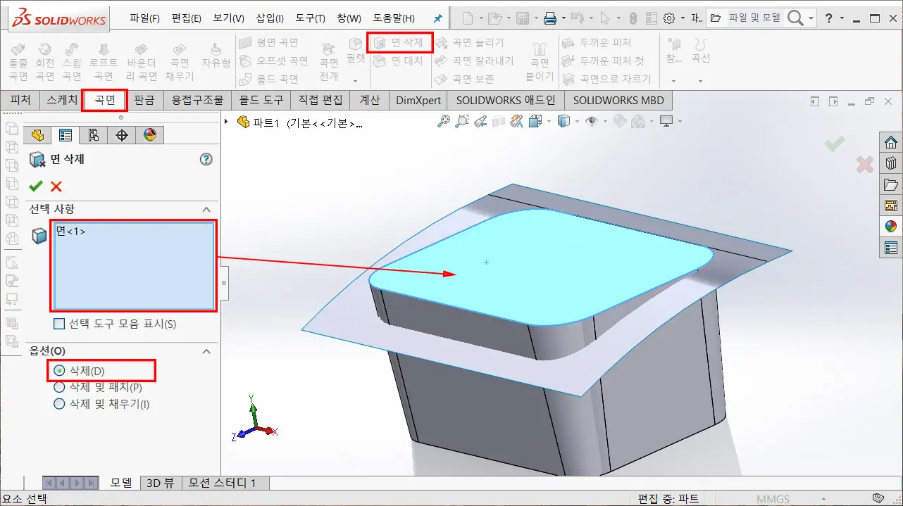 ① 곡면 탭에서 면 삭제를 실행하고, 처음 돌출한 바구니 형상의 윗면을 선택하고, 면을 삭제할 때 옵션은 삭제로 선택한 후 제거한다.