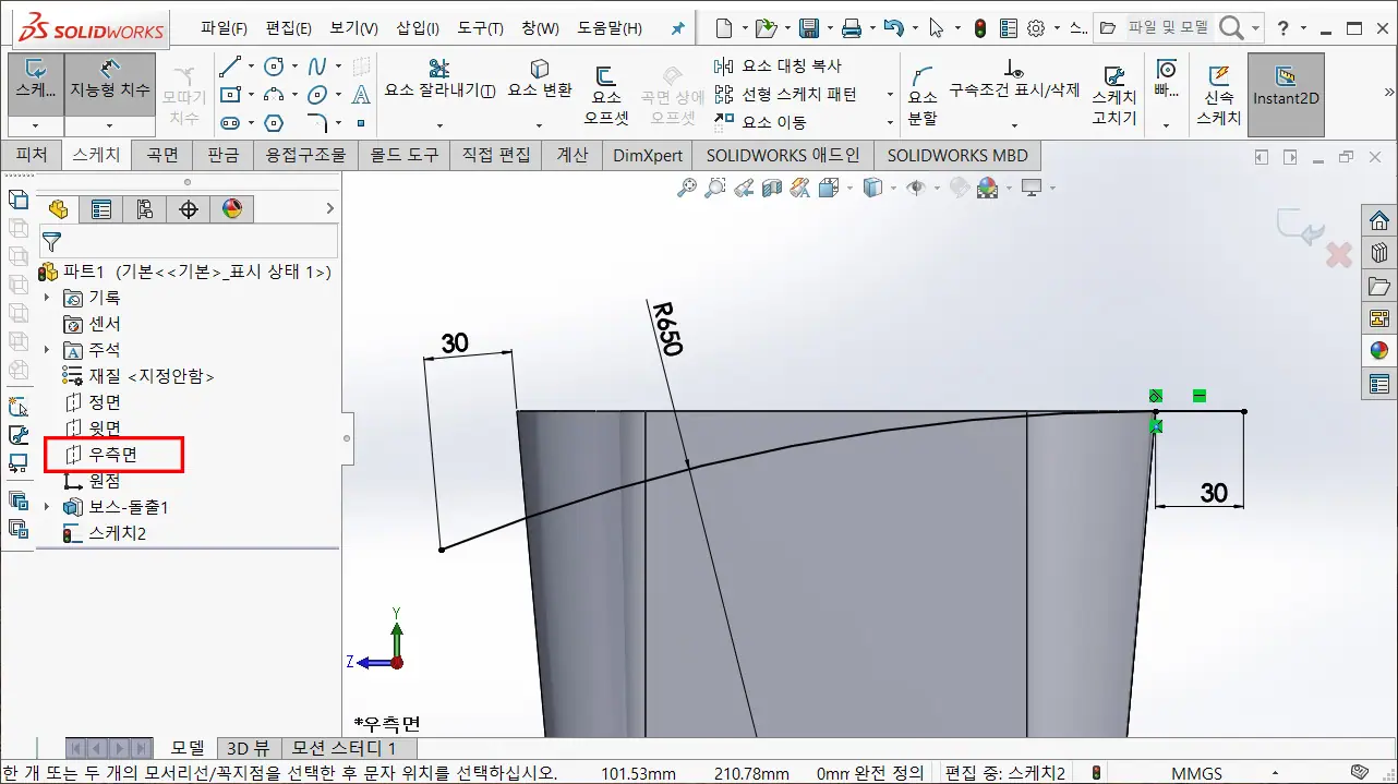 ① 우측면을 기준으로 새 스케치를 시작하고, 도면과 같이 바구니 윗부분에 해당하는 스케치를 작성한 후, 바구니 손잡이를 만들기 위해서 필요한 스케치의 여유값은 대략적으로 30mm로 구속하고, 마무리한다.