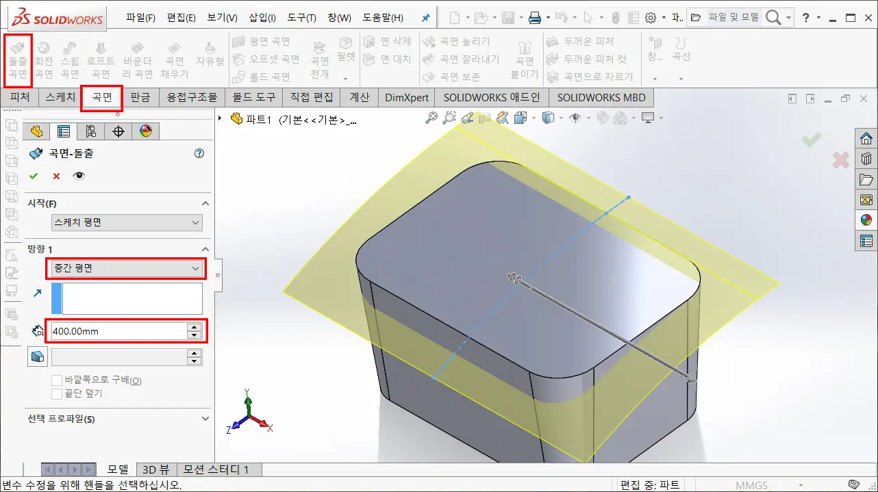 ② 곡면 탭에서 돌출 곡면을 실행하고, 돌출 방향을 중간평면으로 지정한 후, 돌출 값은 400mm 정도로 대략적으로 생성한다.