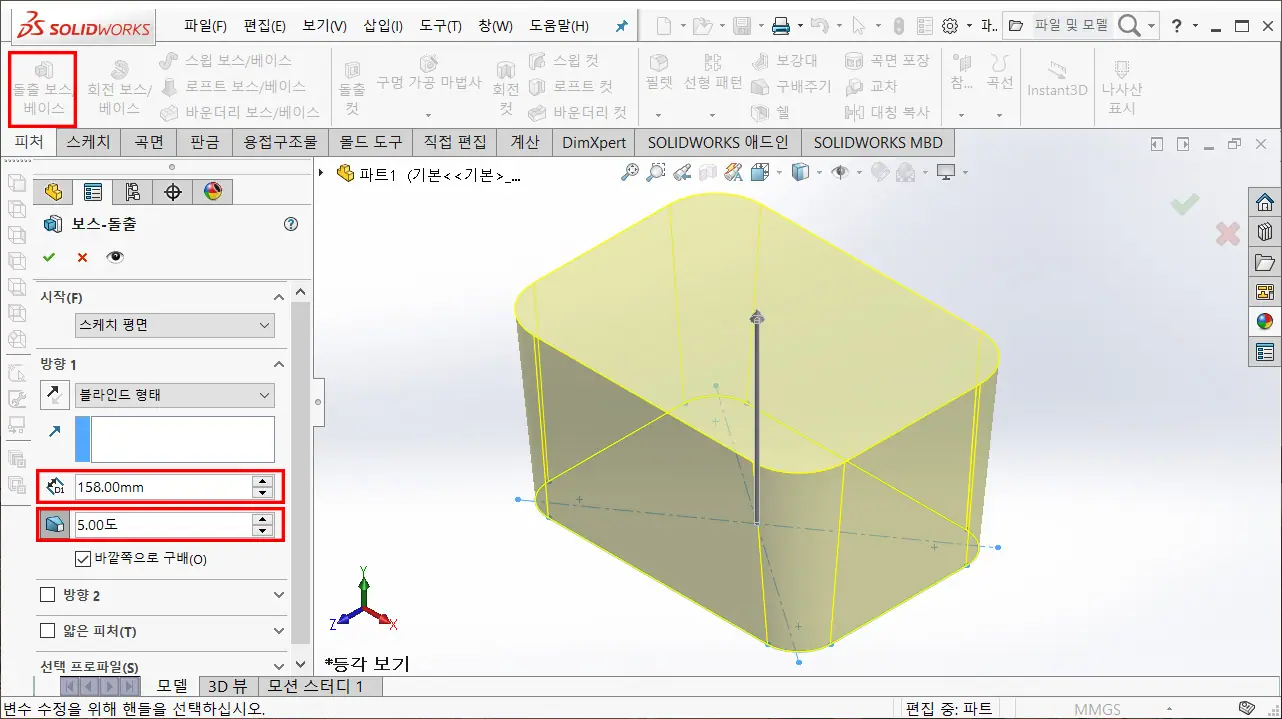 ③ 돌출 보스/베이스를 이용해서 도면과 같은 돌출 높이를 입력할 때, 바구니 두께만큼 줄여서 값을 입력한다.