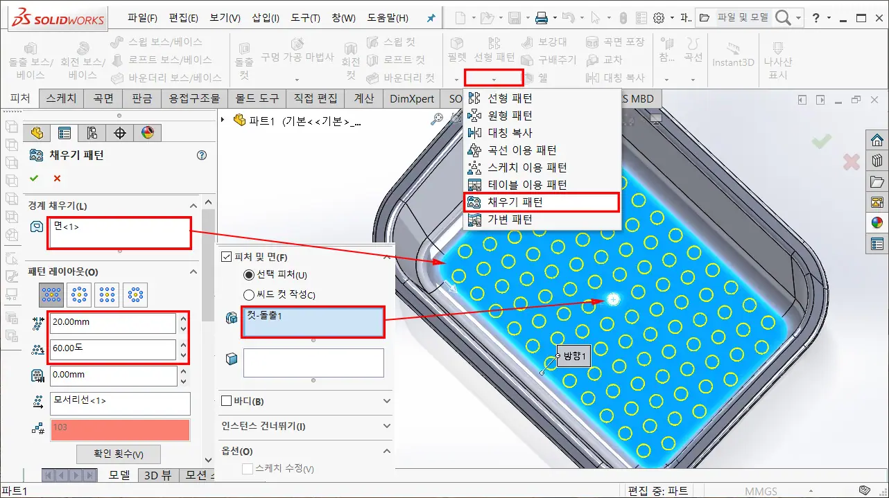 ③ 선형 패턴 하위 탭에서 채우기 패턴을 실행한 후, 경계 채우기에서 구멍이 생성될 바구니 아래면을 선택한다.