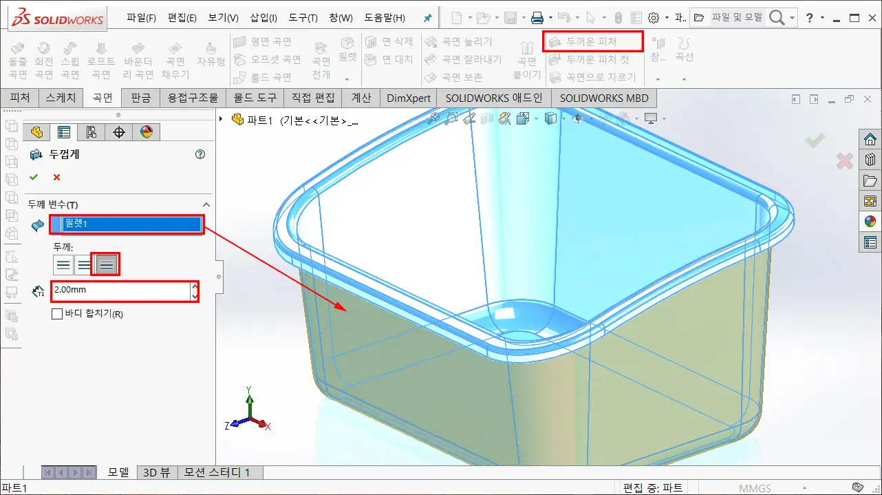 ① 두꺼운 피처 실행하고, 두께를 가진 솔리드를 만들 곡면 객체를 선택한다.