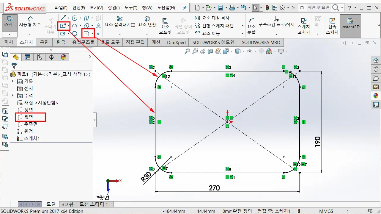 ② 스케치된 사각형에 스케치 필렛을 이용해서 도면과 같이 모깎기를 적용한다.