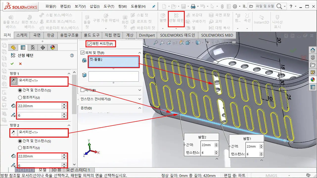 ④ 패턴 할 돌출 컷 피처를 선택하고, 방향 2 옵션에 있는 패턴 씨드만을 체크하고, 완성한다.