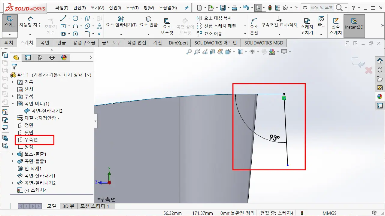 ① 손잡이 턱을 생성하기 위해서, 우측면을 선택하고 새 스케치를 시작한 후, 선으로 곡면 끝점을 기준으로 대충 선을 작성하고, 치수 구속으로 구배 각도를 지정한다.