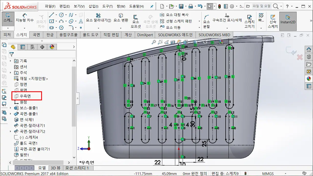 ① 우측면을 선택하고, 새 스케치를 시작하며, 도면과 같이 장공형태를 모두 스케치한다.
