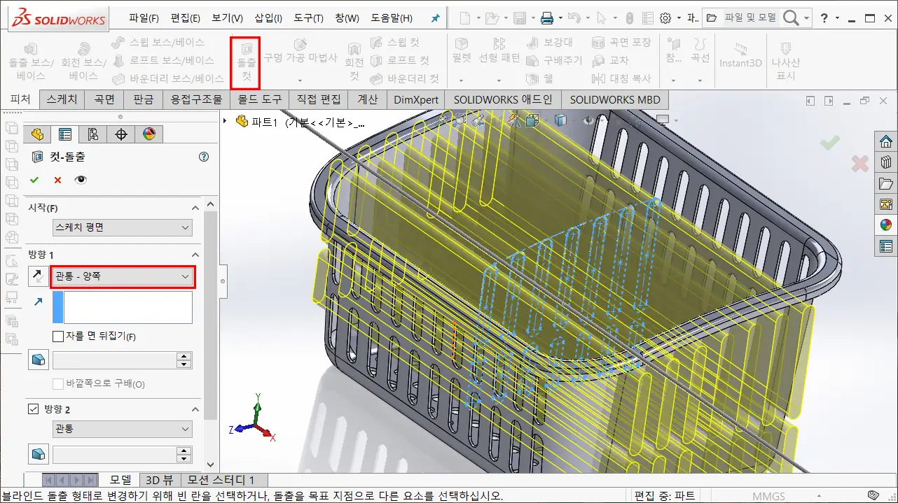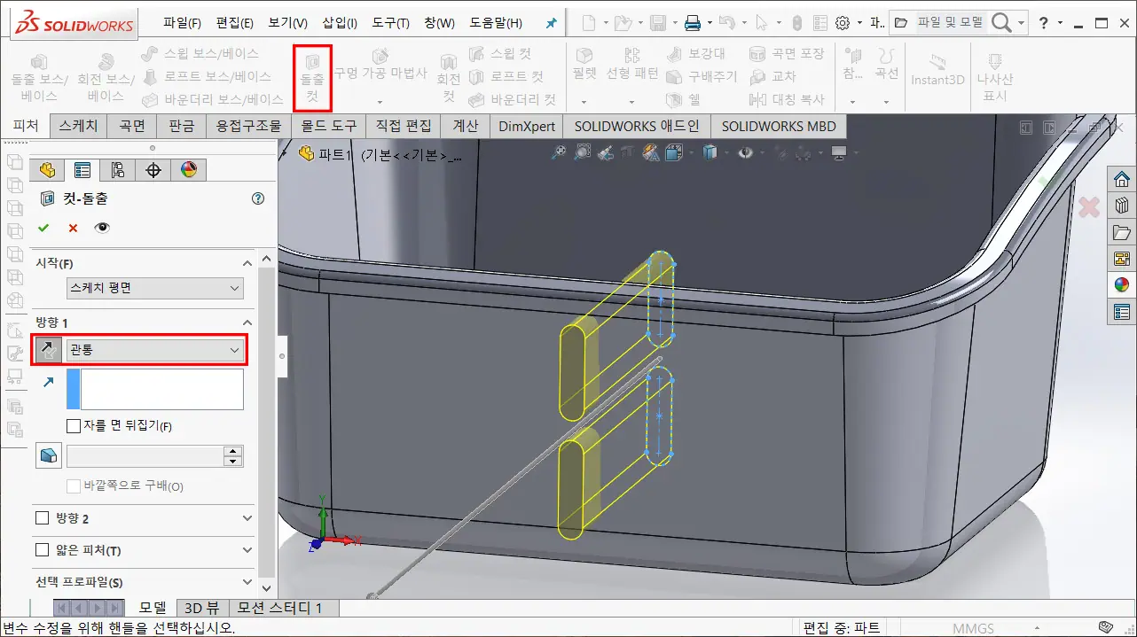 ② 돌출 컷을 실행 후, 관통 양쪽으로 양방향 관통 피처를 생성하여, 마무리한다.
