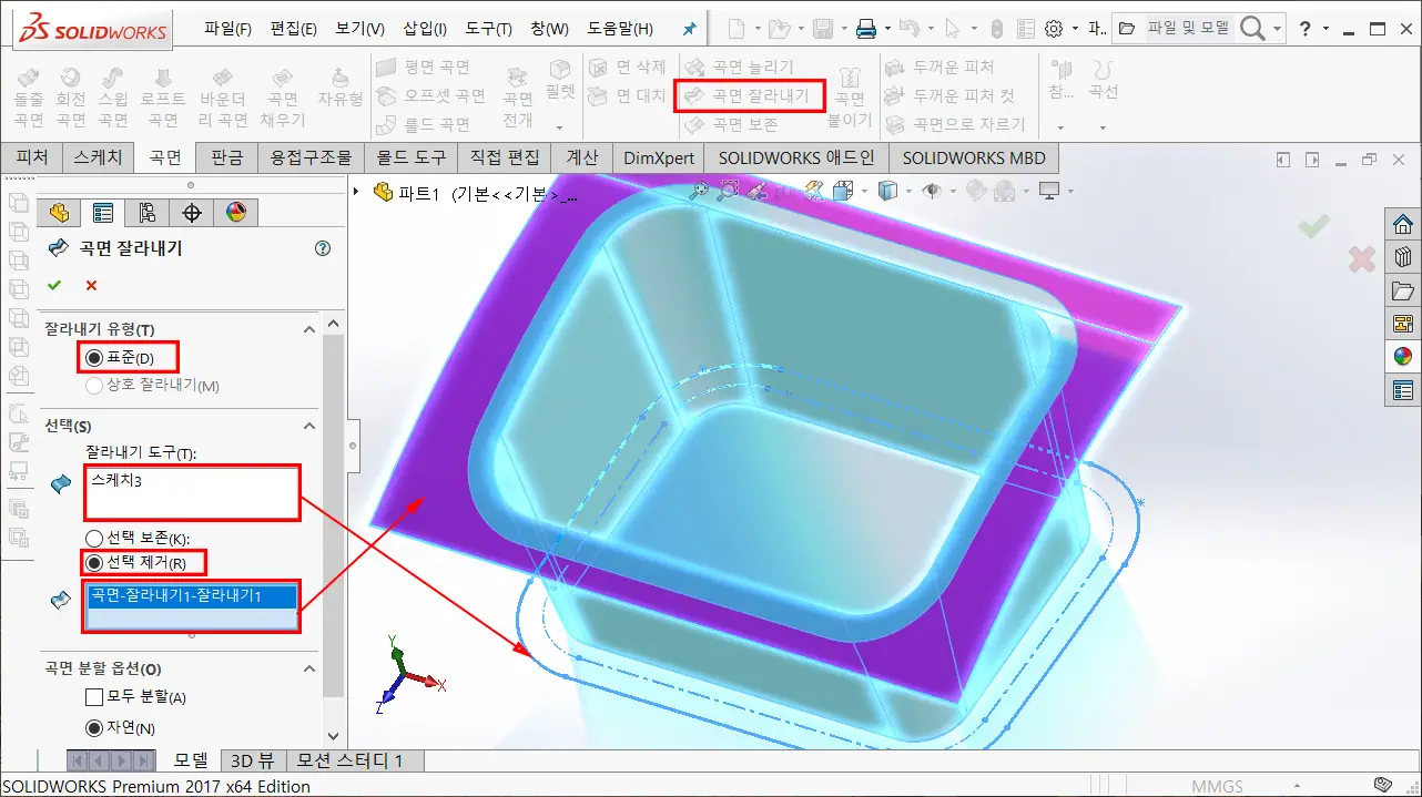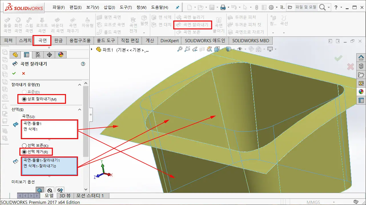 ※ 곡면 잘라내기에서 선택 제거로 작업해야 한다.