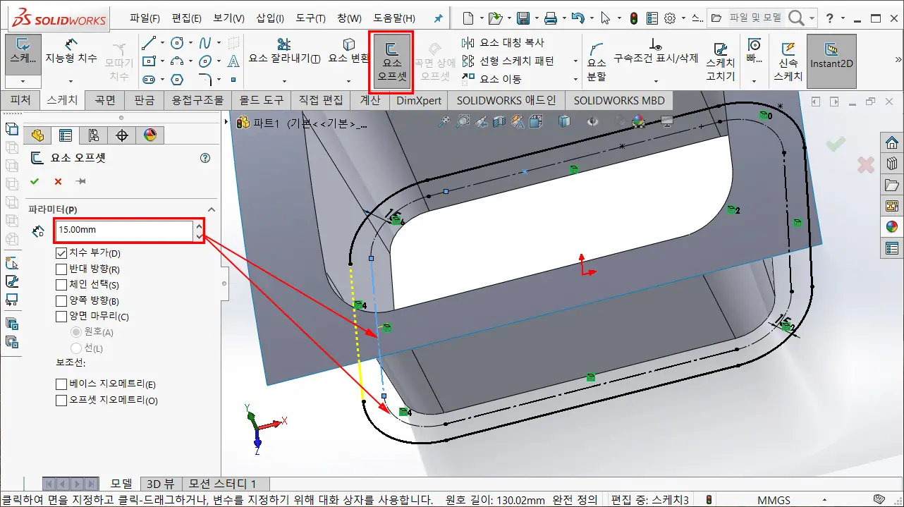 ② 보조선으로 변경된 참조 스케치 선을, 오소 오프셋을 이용해서 도면과 같은 값 15mm로, 스케치 선분을 간격 띄우기 한다.