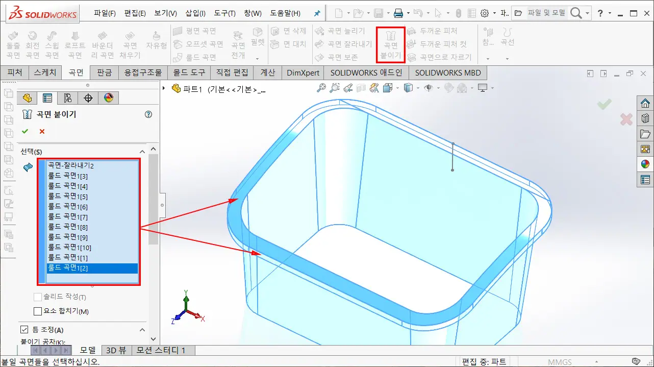 ① 롤드 곡면으로 생성된 객체와 곡면 잘라내기 한 바구니를 하나의 곡면으로 만들기 위해서, 곡면 붙이기를 실행한 후, 모든 곡면을 선택해서 하나의 곡면으로 붙인다.