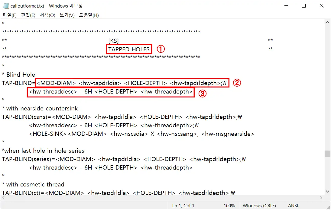 이외에도, 탭 구멍에 카운터 싱크가 있는 경우에 대한 속성도 있기 때문에 잘 확인해서 수정해야 하며, 해당 속성 뒤에 줄 바꿈 된 추가 정보가 있다면, ` ;\ ` 표기해 넣어야지만, 줄 바꿈 된다.