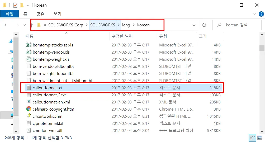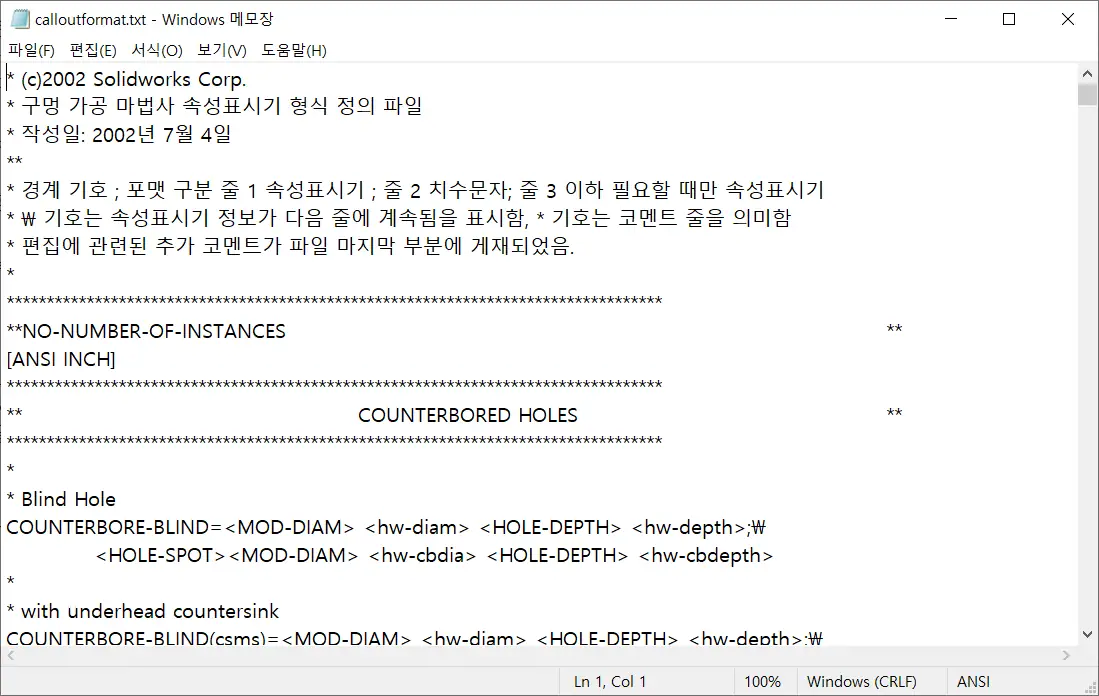 파일이 위치한 경로는 `C:\Program Files\SOLIDWORKS Corp\SOLIDWORKS\lang\korean` 폴더 안에서 `calloutformat.txt` 를 찾으면 된다.