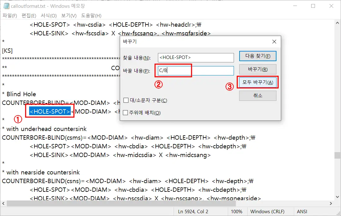 `찾기 (Ctrl + F)`를 이용해서 찾으셔도 되겠지만, 파일 내에 있는 속성들이 규격과 구멍 종류에 맞게 별도로 되어 있기 때문에 일일이 찾아가면서 변경하기는 쉽지 않을 수 있지만, 어떤 구멍 규격을 이용하던, 국내/외 도면 표기가 거의 동일하기 때문에, `바꾸기(Ctrl + H)`를 이용하는 것이 훨씬 편리할 것이다.^^