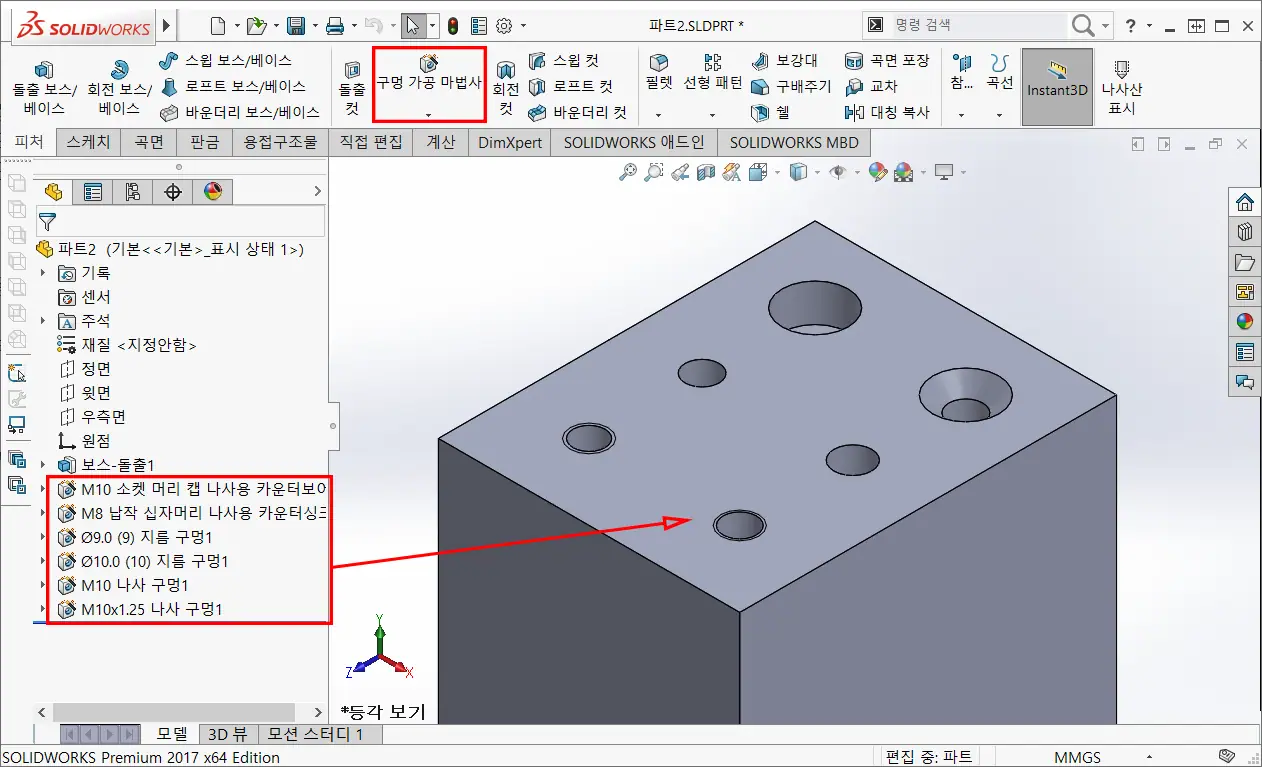 참고로, 솔리드웍스 도면에서 구멍 속성 표시기로 치수를 생성하고자 한다면, 파트 모델링할 때 구멍가공 마법사를 이용해서 구멍을 생성해야 한다.