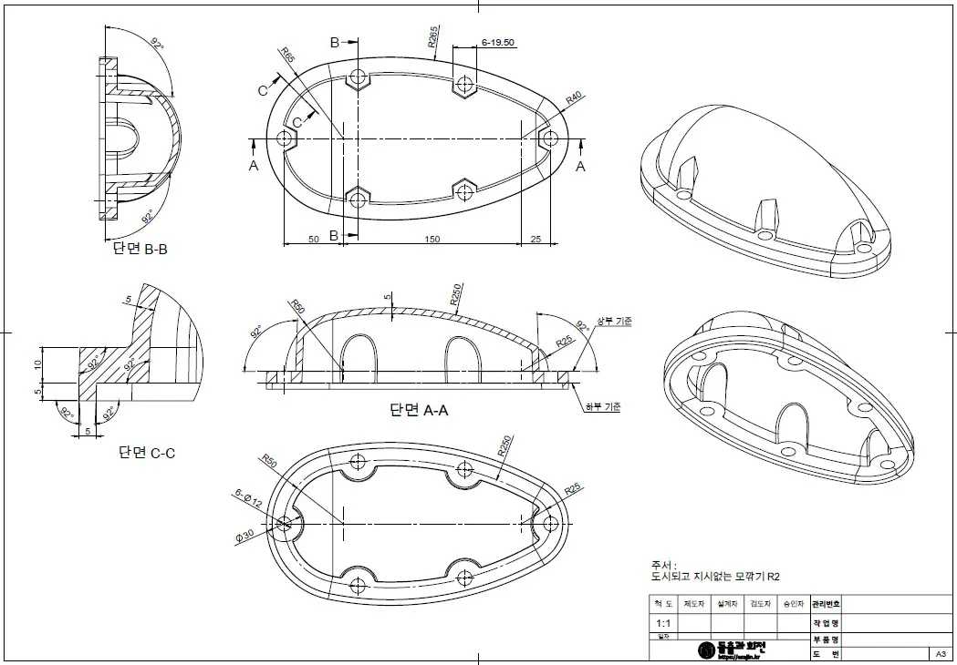 위 도면은, 기존 도면을 국내 환경과 공부하는 도면 실정에 맞춰 돌출과 회전™ 이 직접 작성한 도면으로, 혹시나 치수 등 누락된 부분이 있으면, 댓글로 알려주시기 바란다.^^