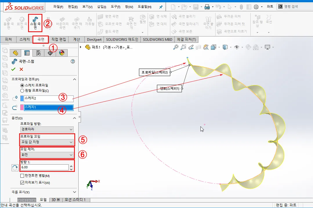 - 꼬임 개수는 6호 꼬임으로 이전과 동일하게 지정한 후, 스윕 곡면 꼬임의 방향을 처음 만든 곡면과 자연스럽게 이어지는지 확인한다. 만약, 자연스럽게 이어지는 방향이 아닌 경우, 꼬임 방향을 반대방향으로 지정하여 곡면을 생성한다.