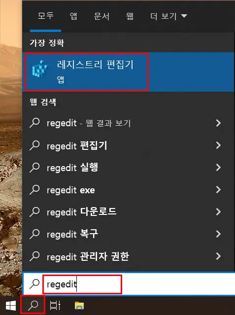 윈도우 하단 작업표시줄에서 돋보기를 클릭해서, "regedit"를 검색하고, 상단에 레지스트리 편집기를 클릭하여 레지스트리 편집창을 실행시키거나, window+R을 눌러 실행창에서 "regedit"를 실행한다.