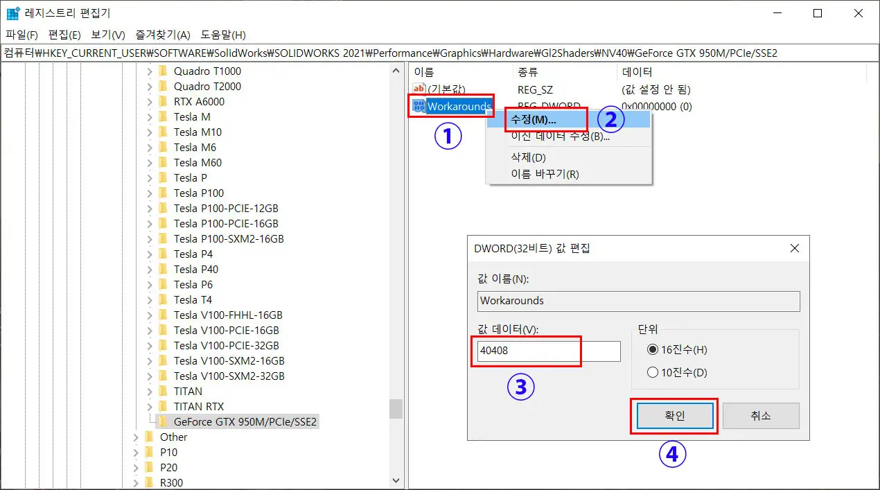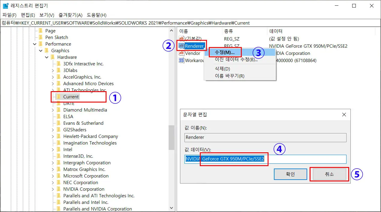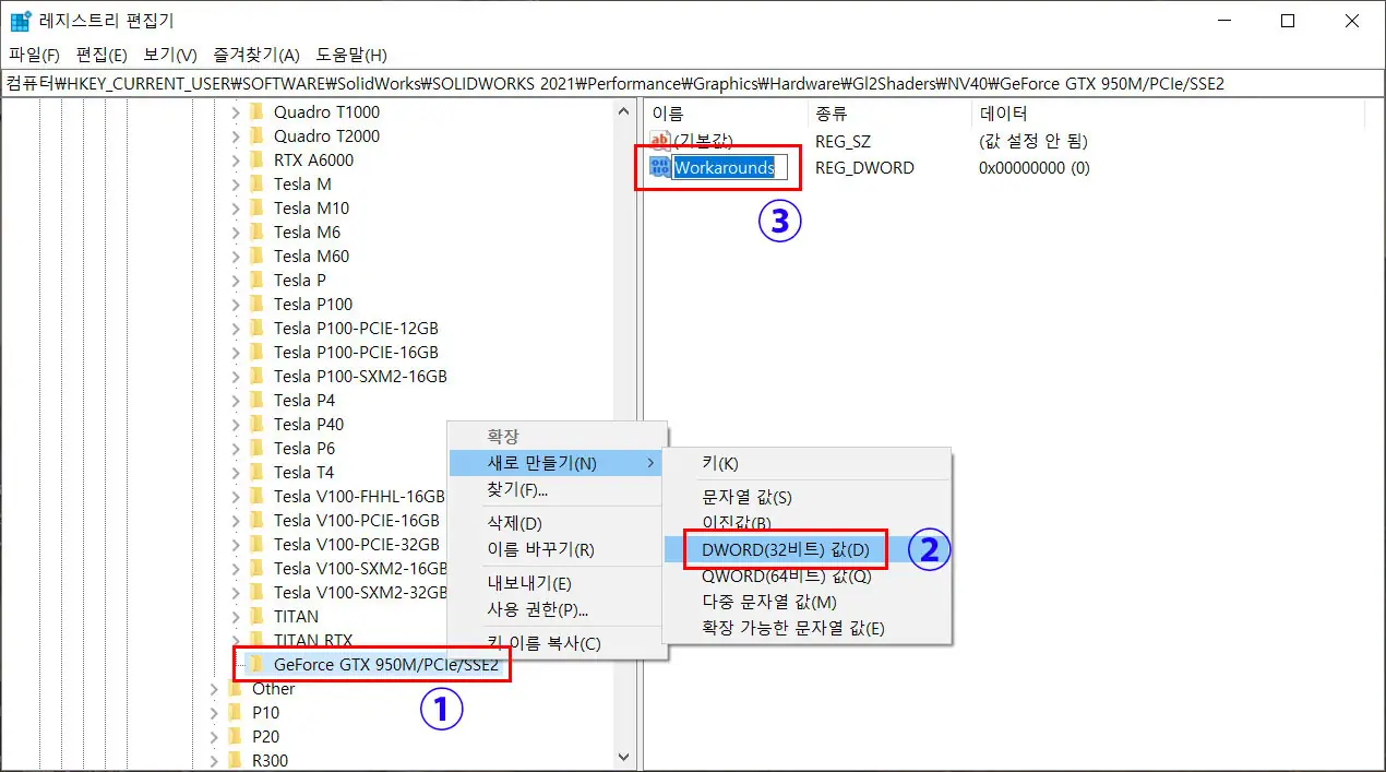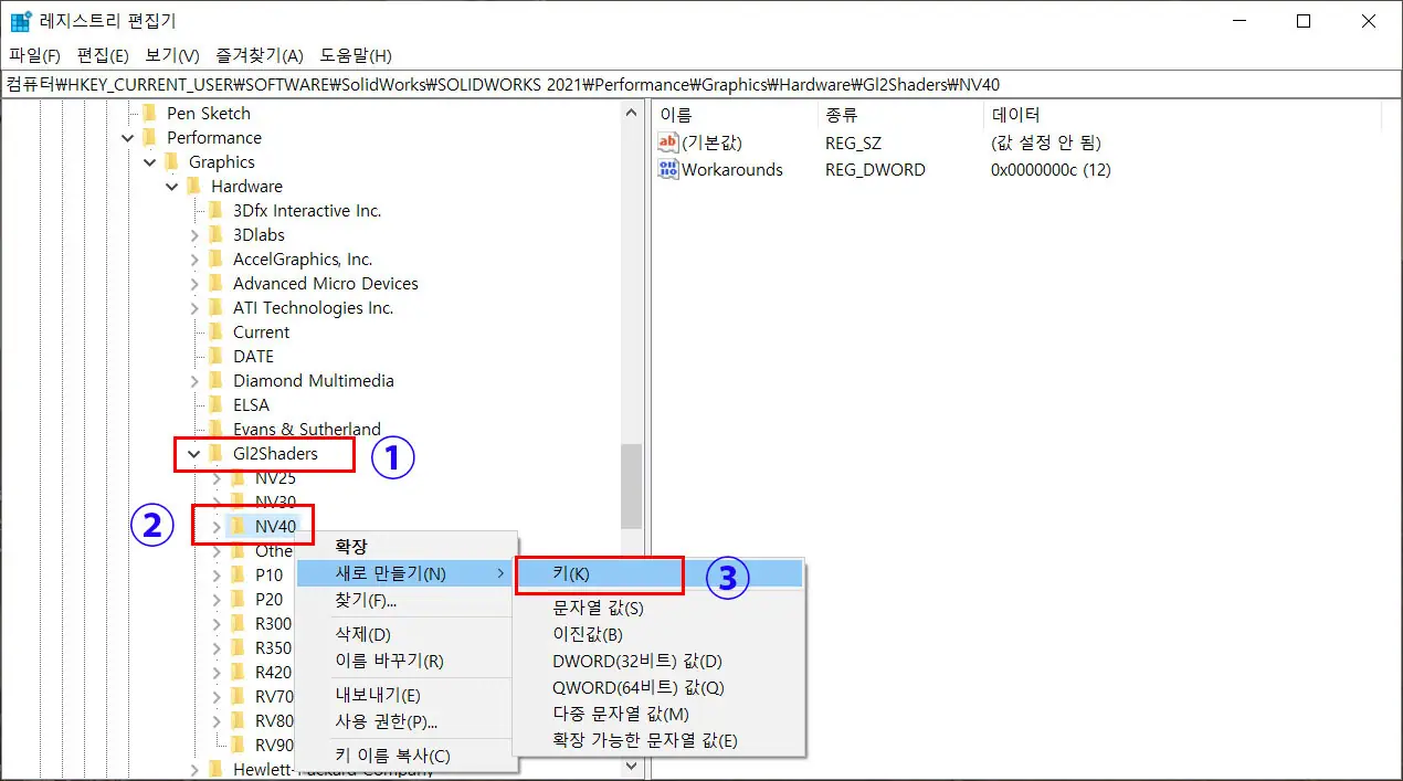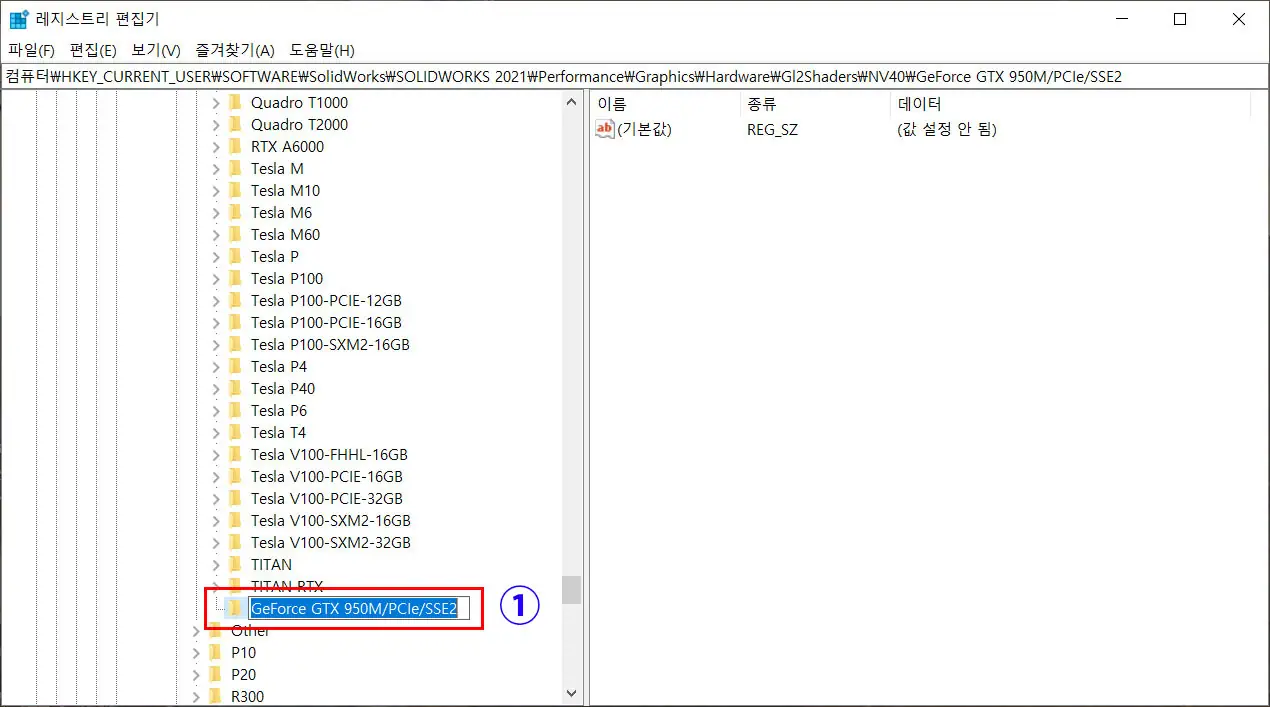 컴퓨터 루트 -> HKEY_CURRENT_USER -> SOFTWARE -> SolidWorks -> SOLIDWORKS 해당 버전 -> Performance -> Graphics -> Hardware
