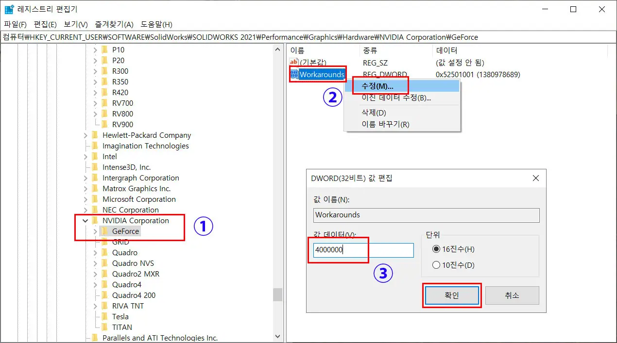 컴퓨터\HKEY_CURRENT_USER\SOFTWARE\SolidWorks\SOLIDWORKS 해당 버전\Performance\Graphics\Hardware