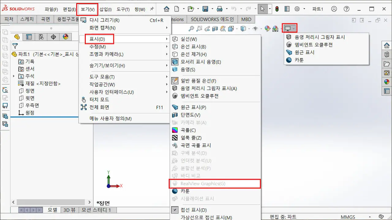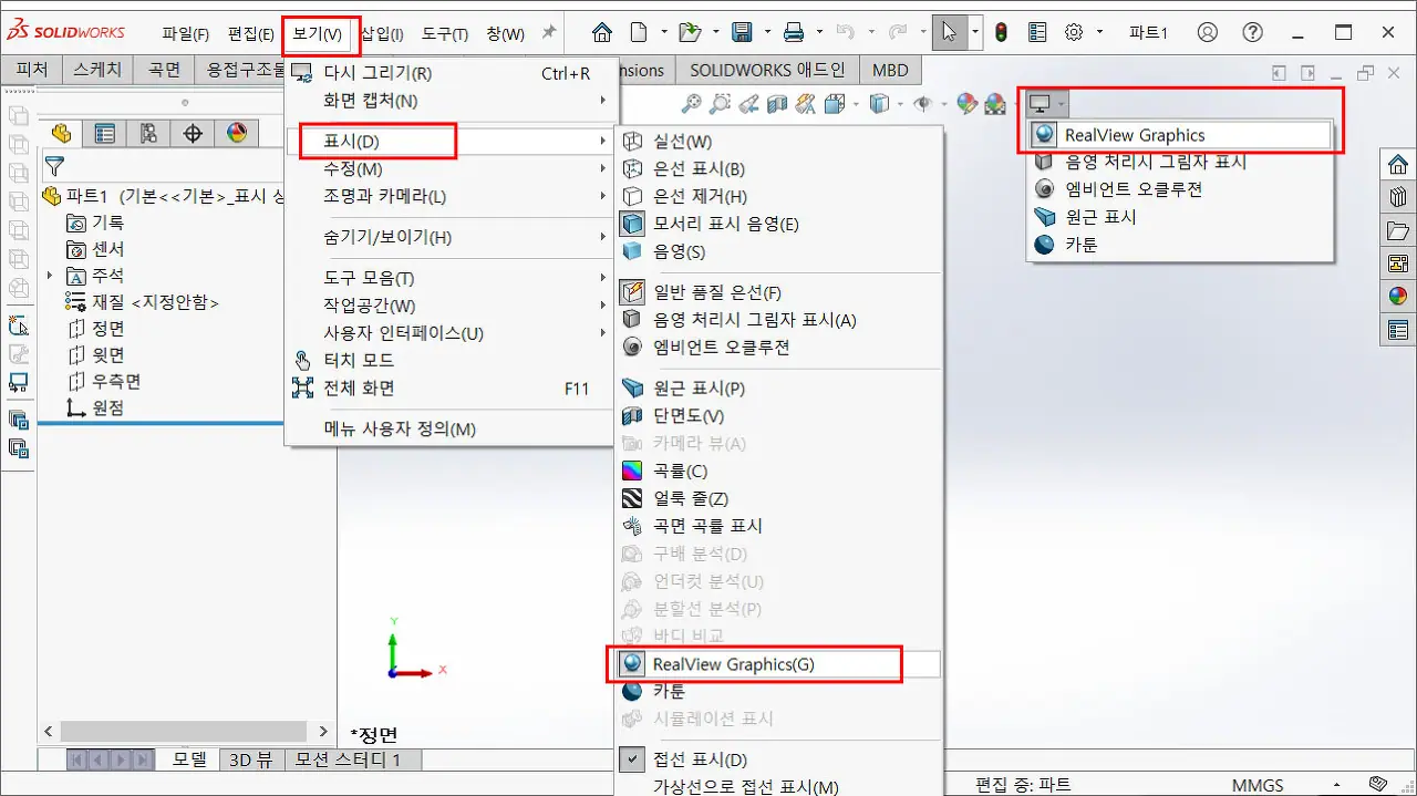 위 솔리드웍스 작업환경에서 보듯이 메뉴바 보기 옵션에서도, 작업화면 뷰 설정에서도 RealView Graphics는 보이지도 않고 비활성화되어 있는 가장 익숙한 모습을 볼 수 있다.