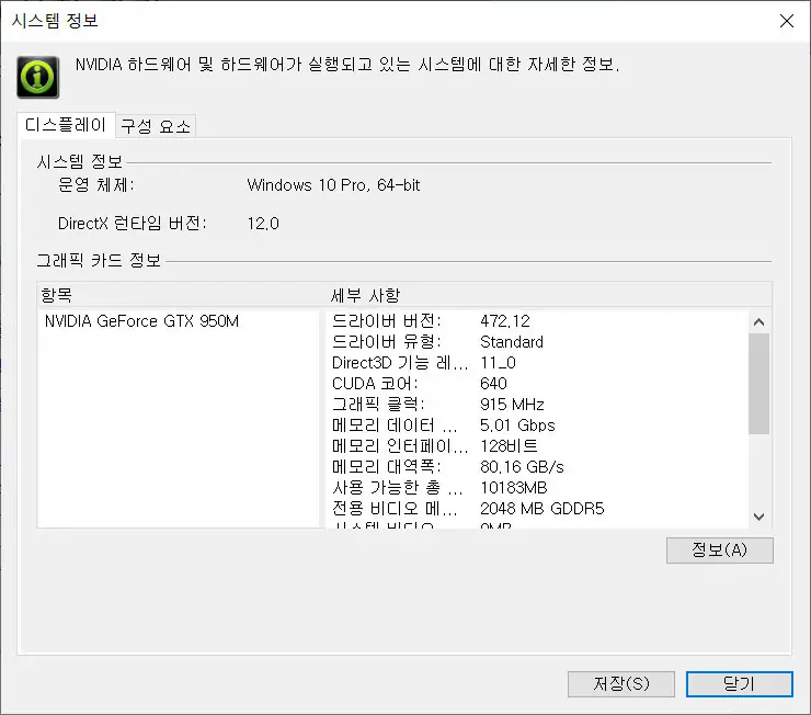 위 이미지는 외장 그래픽 GTX 950M의 기본 정보이며, 드라이브 버전이 472.12로 된 사양이다.
