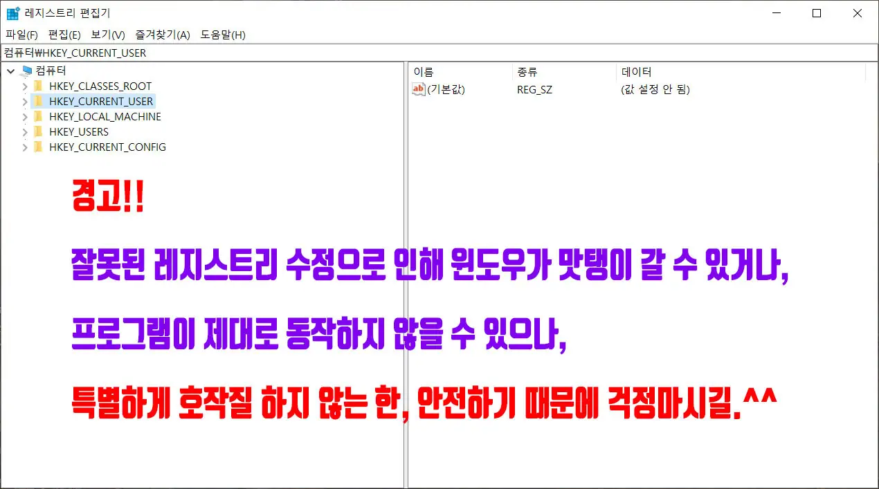 앞에서도 언급했지만, 레지스트리는 윈도우로 따지면, 뇌세포에 해당하는 기능을 갖고 있기 때문에 행여나 잘못됨을 불안해하시는 분들은 꼭 백업해 두고 진행해야 한다.