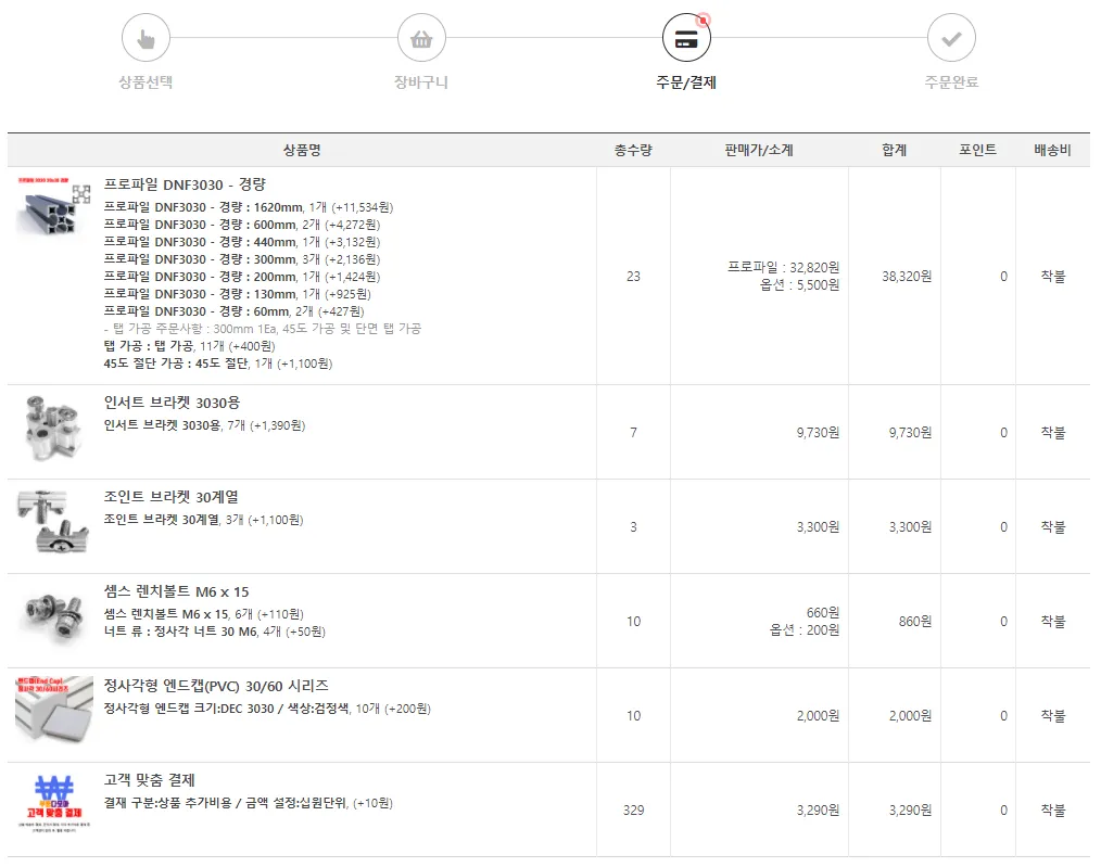 프로파일 주문은 지난번에 노트북 테이블 조립용으로 주문했던 부품 다모아(https://hitc.kr) 쇼핑몰에서 구매를 했다.