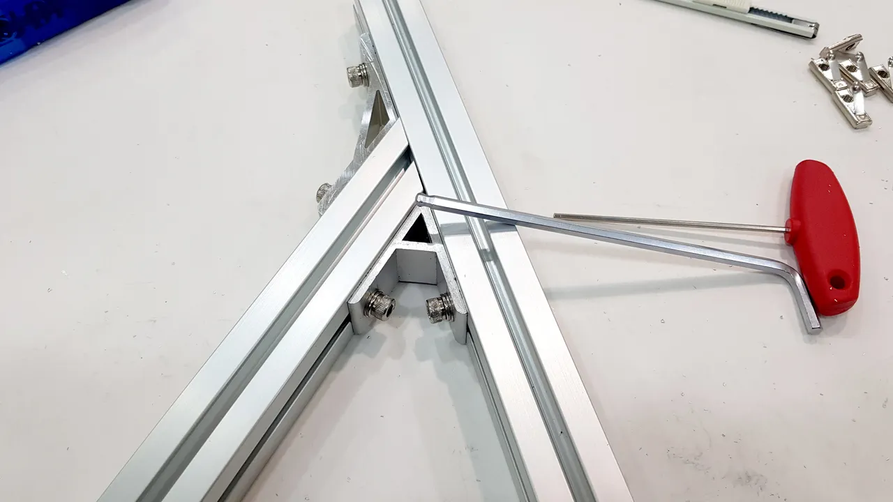조인트 브래킷 조립은 조인트 브래킷 뭉치에 같이 배송된 센터 볼트를 넣고, 프로파일에 십자드라이버로 조이기만 하면 된다.