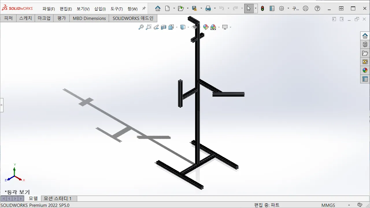 물론, 손으로 먼저 대략적인 형태와 크기를 정하고, 솔리드웍스 2D/3D 스케치로 기본 뼈대를 작성하고, 용접구조물을 이용해서 프로파일 구조를 배치했다.