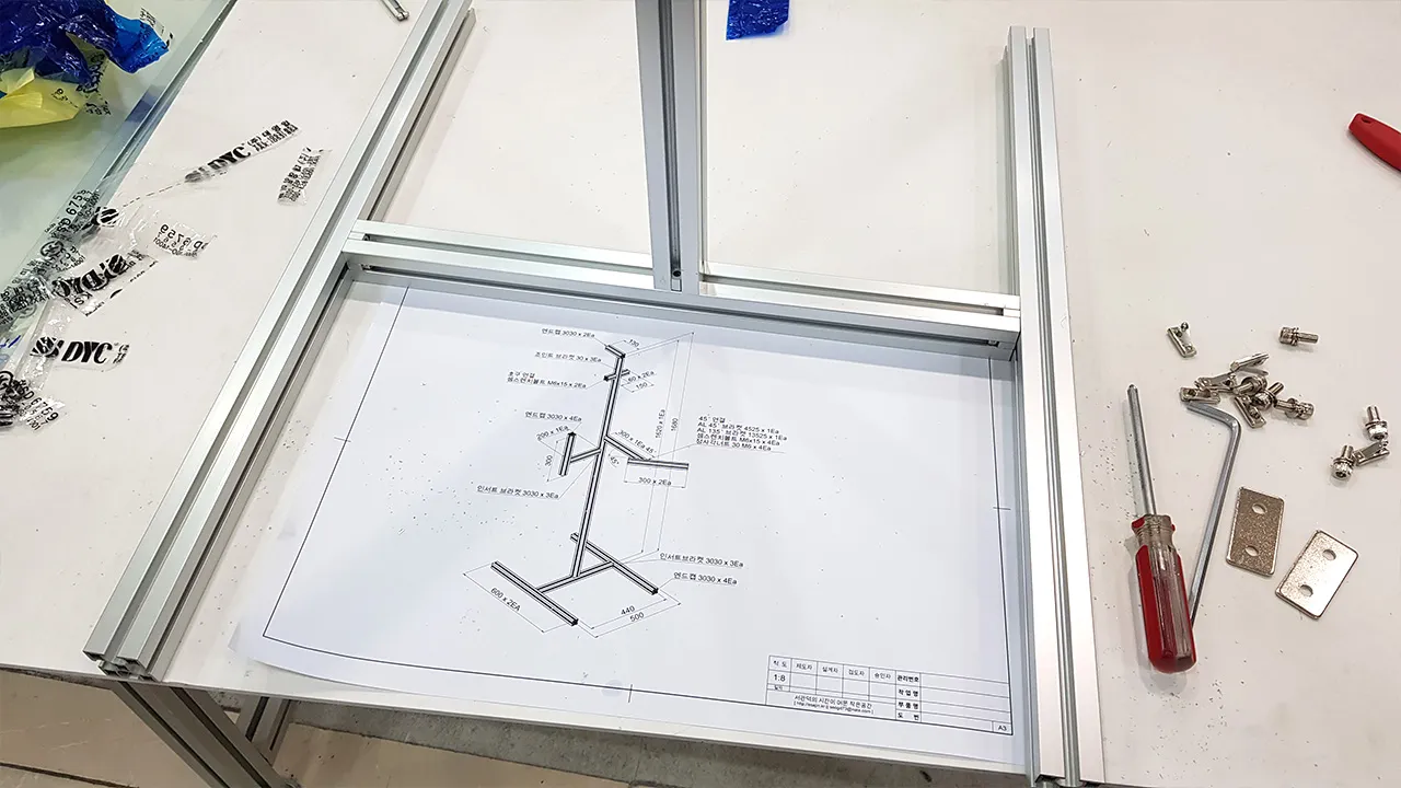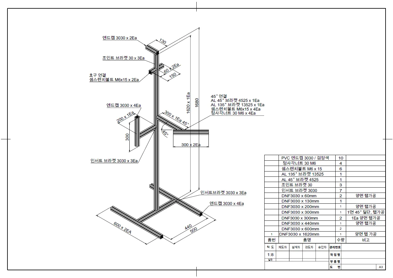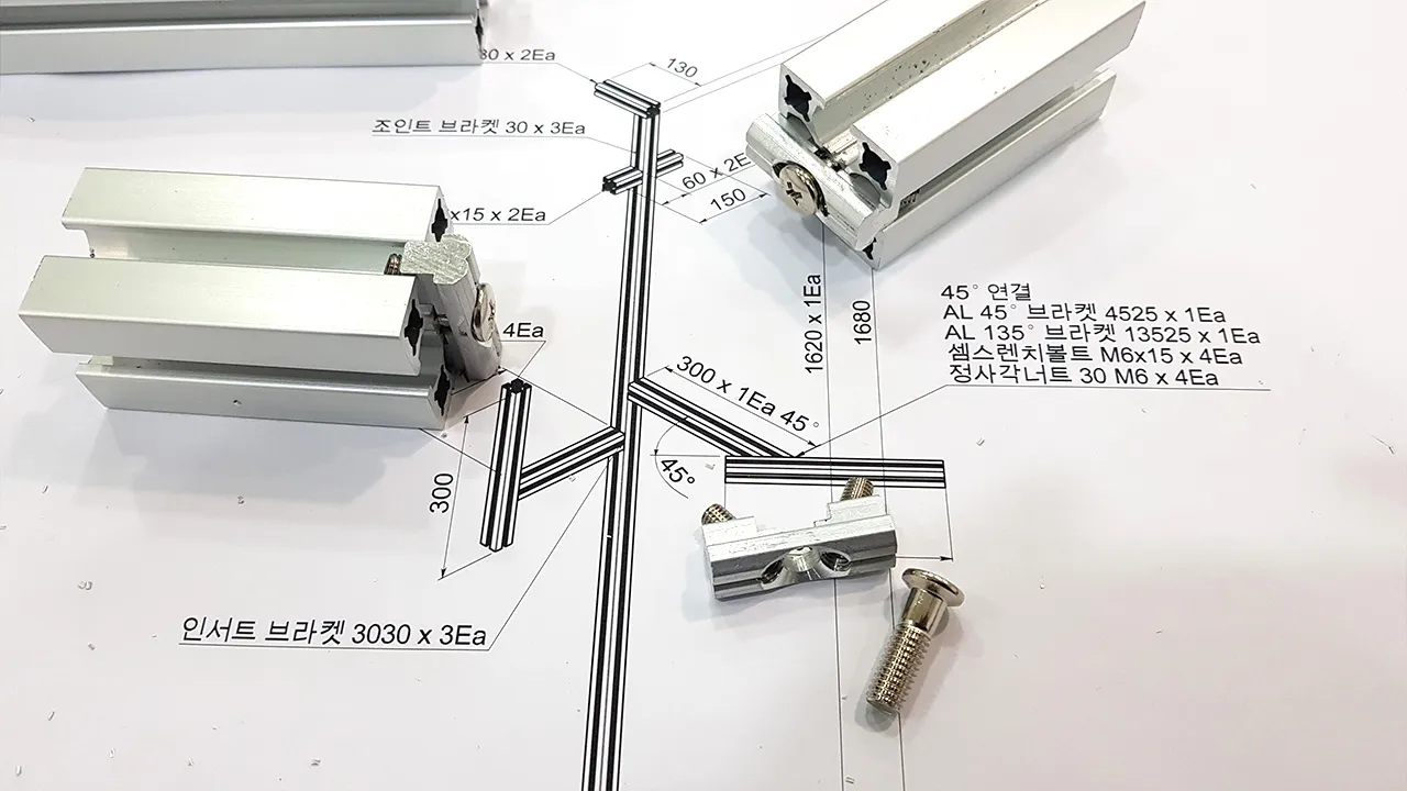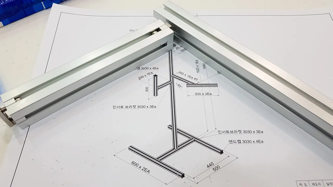 프로파일 및 부품 선택과 수량을 위해 도면 작업에 30분 정도 투자한 것 같고, 지금까지 그 어떤 곳에서도 찾아볼 수 없었던, 검도 타격대의 기본 구조가 탄생하는 순간이다.