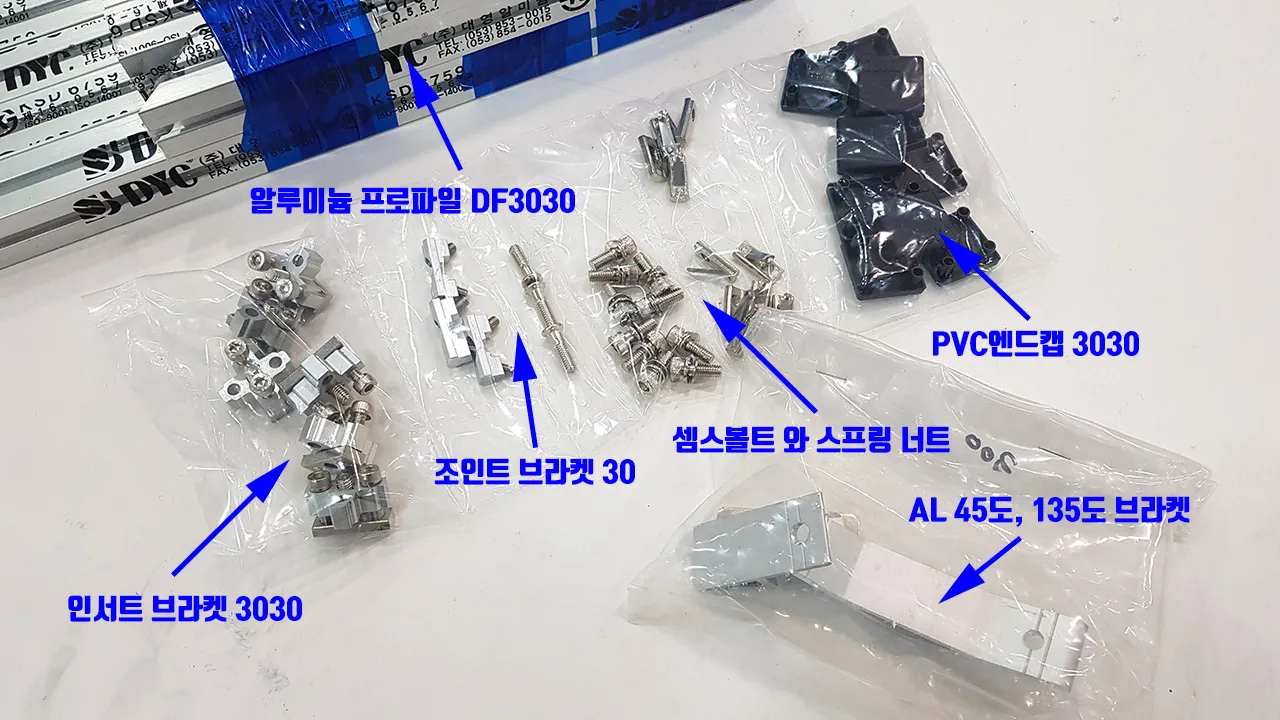 지난 2번의 조립은 2020 프로파일을 사용했기 때문에, 코너블록 외 다른 스마트 부품을 사용하지 못했지만, 이번에는 3030프로 파일로 사용했기 때문에 몇몇 가지 조립에 편리성을 높일 수 있는 스마트 부품을 주문할 수 있었다.