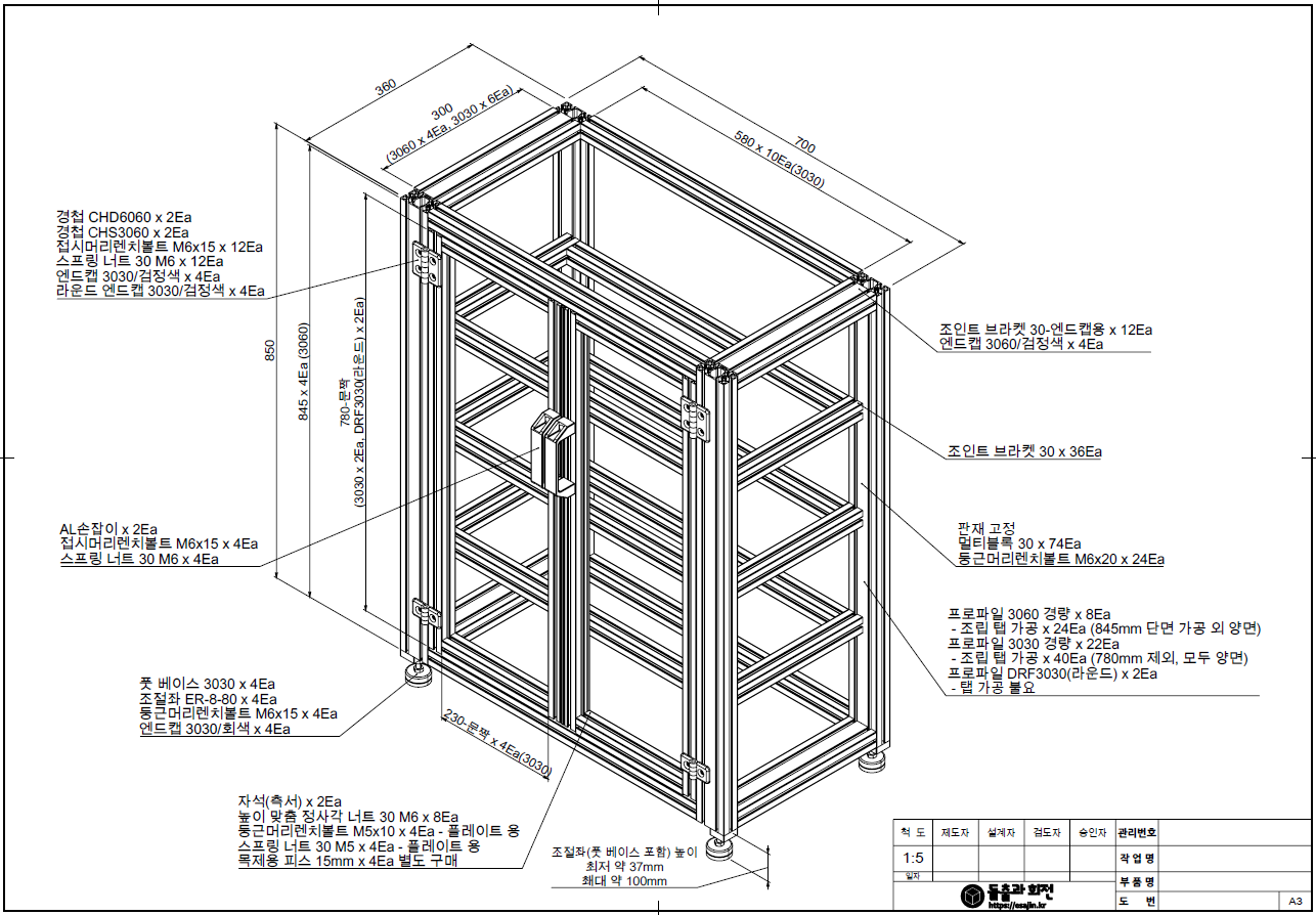 그리고, 프로파일은 3030 경량 프로파일로 선택했는데, 2020과 같이 경량 구조로 만들까 했지만, 경첩을 달아서, 여닫이 문도 달아야 하고, 나무 판재로 마감을 해야 했기 때문에, 부품 선정과 조립성을 고려해서 조금은 비싸지만 3030과 3060프로파일로 설계한 것이다.