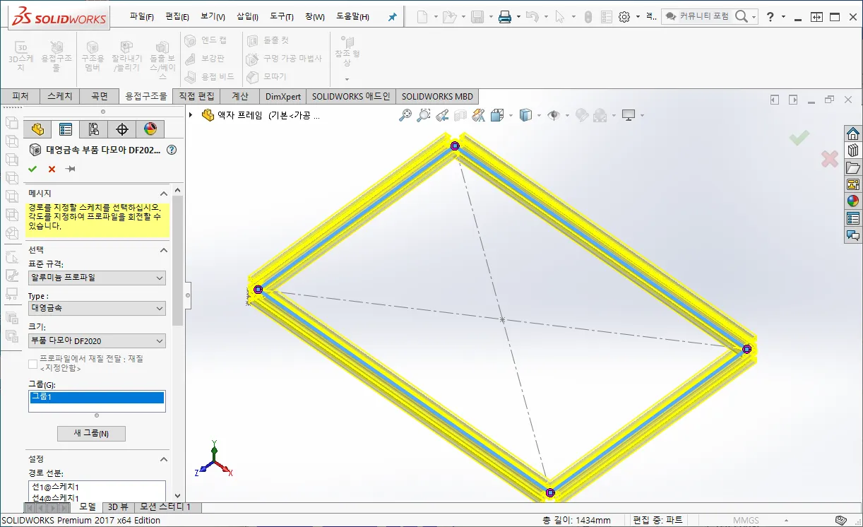 솔리드웍스 용접 구조물을 이용하여, 간단하게 프레임 구조를 작성할 수 있는 기능을 제공하고 있다.